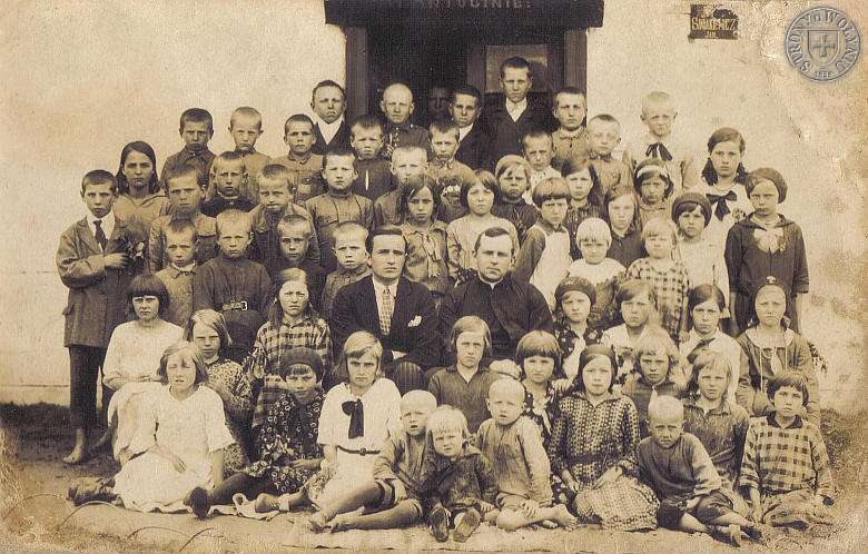 | Zdjęcie zrobiono przed wejściem do domu Jana Siniakiewicza i Anny z d. Sztandara, w którym mieściła się szkoła. Siedzą – dyrektor szkoły Bronisław Kaczmarski i ksiądz Faustyn Lisiecki – proboszcz w Rudni Potaszni. W nogach dyrektora, w białej sukience z ciemną kokardą siedzi Zofia Sztandara. Na prawo od niej Jarosław, Helena i Stanisław Siniakiewiczowie. Obok księdza, w nakryciu głowy, siedzi Agata Siniakiewicz. Patrząc od Agaty w prawo, osoba siedząca trzy miejsca dalej, na samym końcu rzędu to Ewa Piotrowicz. Rząd wyżej, trzecia od prawej, w koszuli w kratę stoi Anna Siniakiewicz. W najwyższym z rzędów, drugi od lewej stoi Konstanty Siniakiewicz. Pierwszy od lewej boso, ale w krawacie (sam się ubierał i zapomniał butów) Stanisław Żygadło - s. Jana. Pozostali nierozpoznani. - „Foto Sitnera, Berezne, ul. 3-go Maja nr 2... (20?) Własność - Jadwiga Piotrowicz z d. Lech | |