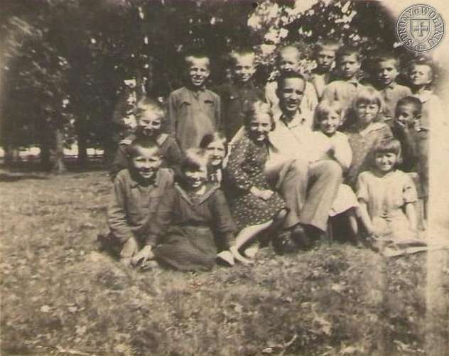 | Górny rząd, od lewej: NN, Hieronim Morawski (Onyń), Dymitr Iwańczuk ( gdzieś z futoru Białoszowskiego), Andrzej Semenowicz, Ferdynand Wagner (Antolin), Fedor Fiodorow, Jarosław Siniakiewicz (Antolin). Dolny rząd: Zbigniew Myśliński (Antolin), Alfred Litka (Antolin), Helena Kowal (Antolin), Aleksandra Osadczuk (Antolin), Maria Siniakiewicz (Antolin), Bronisław Kaczmarski – dyrektor szkoły, Anisja Siniakiewicz (Antolin), Władysława Morawska (Onyń), Raisa Stepaniuk (Antolin), Jan Chmielnicki (Antolin). Własność - Krzysztof Kołwzan | |