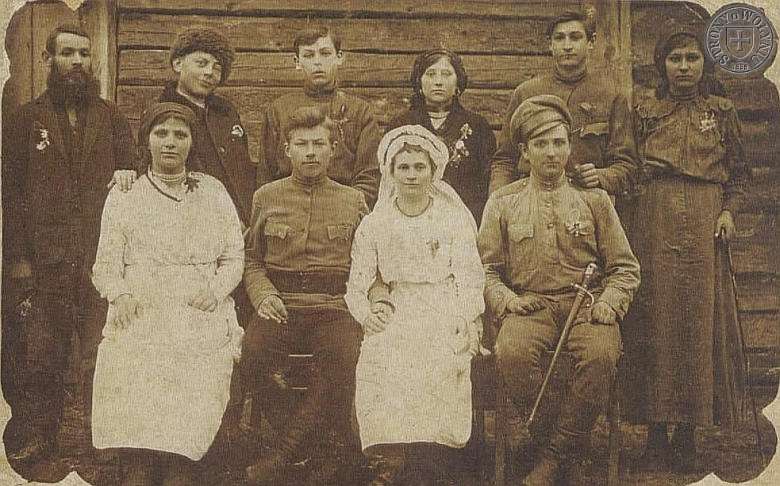 | Rząd stojący, od lewej: Józef Sztandara – brat panny młodej, NN parobek Piotra Siniakiewicza, Piotr Siniakiewicz – brat pana młodego, Katarzyna Stepaniuk – córka Daniela i Krystyny, Adam Sztandara – brat panny młodej, Maryna Siniakiewicz – bratanica pana młodego – córka Nikodema i Tekli z d. Radziewicz. Rząd siedzący, od lewej: Ewa Sztandara z d. Sobiecka – żona Adama – bratowa panny młodej, pan młody Jan Jonasz Siniakiewicz – syn Jana i Marii z d. Rówieniec, panna młoda Anna Siniakiewicz z d. Sztandara – córka Juliana i Franciszki z d. Osicka, Stanisław Sztandara – brat panny młodej. Własność - Genowefa Matyja z d. Kuriata | |