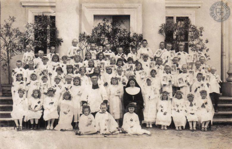 <<< | Na zdjęciu są m in. Józefa i Władysława Miler, dzieci od Kościelnych, proboszcz parafii beresteckiej w latach 1934-1944 ks. Jerzy Zwoliński. Siostra zakonna należała do zakonu sióstr nazaretanek, które w Beresteczku prowadziły internat. Na odwrocie zdjęcia znajduje się pieczątka Foto/M [?] Handelsmann/ Beresteczko. | >>> |