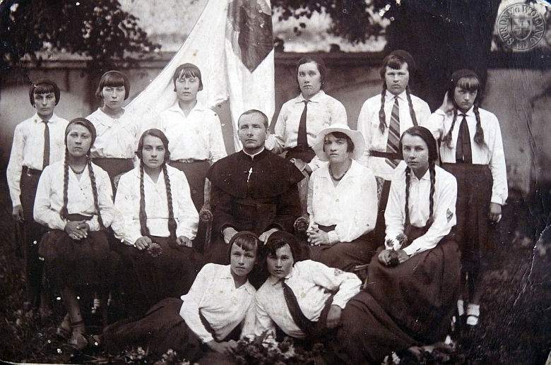 <<< | Od góry: 1.Tola?, 2.Celina Dec (po mężu Jaroszyńska). 3.Zofia Zwierzyńska, (Sztandar) 4.Jadwiga Szulakiewicz, 5.Konstancja Koszeluk, 6.Leokadia Gruszczyńska, 7.Bronisława Malczewska, 8.Helenka Królikowska. 9.Ksiądz J.Pożerski. 10.Genowefa Rogulska (żona nauczyciela), 11.Stanisława Zwierzyńska 12.(??), 13.Józefa Kostecka (wyszła za Ukraińca w Woronczynie, zamordowana przez UPA) Zdjęcie przysłał i opisał Henryk Koszeluk. Zofię i Stanisławę Zwierzyńskie rozpoznała Maryla Chmielewska. | >>> |