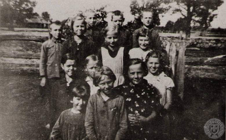 | Zdjęcie zrobiono po wycieczce w ramach lekcji przyrody tuż przed wybuchem II W.Ś. Krzyż znajdował się w centralnym miejscu Kolonii. Robiono przy nim zdjęcia okolicznościowe, odbywały się też przy nim nabożeństwa majowe. W ostatnim rzędzie stoją od lewej: NN; NN;Janek Sulikowski s. Piotra; Mirek Kołodyński s. Bronisława; niżej stoją od lewej: Miśkiewicz Stanisława; Zydka IN z Nowej Kamionki; Mirka Jurewicz c. Grzegorza jeszcze niżej klęczy 6 dziewcząt, od lewej: Anna Basińska c. Feliksa; Joanna Grendusówna; Gienia Jurewicz c. Władysława; Basia (?) Grendusówna; NN; Jadzia Kołodyńska c. Bronisława | |