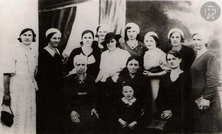| Od lewej stoją: 1.Janina Kołodyńska (ż.Cypriana), 2.Albina Kołodyńska (ż.Stanisława „Tofilczynego”), 3.Janina Kołodyńska (ż.Mieczysława „Mićka”), 4.Helena Kołodyńska (c. Jana Kołodyńskiego „zza Smugi”), 5.Janina Grendus (w kapeluszu, nauczycielka), 6.Józefa Kołodyńska (ż.Jaśka Ignacego), 7.Janina Kołodyńska (ż.Mikołaja), 8.Izabela Zydka (c.Sylwestra Kołodyńskiego), 9.Stanisława Sulikowska(ż.Teofila). Od lewej siedzą: 10.Władysława Basińska (ż.Feliksa), 11.Teofila Kołodyńska („Tofilka”, wdowa po Franciszku), 12.Mirosława Kołodyńska (ż.Cezarego), 13.Jadzia (c.Staśka „Tofilczynego”). | |