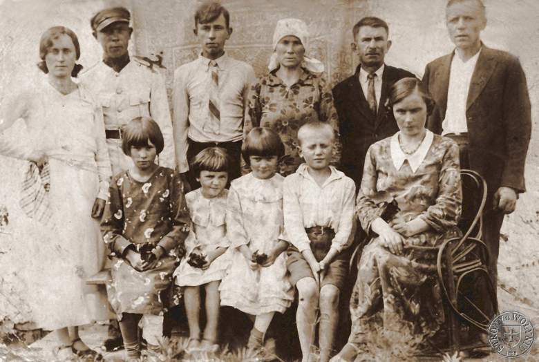 <<< | Stoją Dorota Marchlewicz z d. Sierszyńska, NN osoba w mundurze, Bronisław Sierszyński, Antonina Sierszyńska z d. Świtała, Józef Sierszyński, Andrzej Olenik. Siedzą: córki Olejników: Janina, Wanda i Łucja, Józef Sierszyński - syn Franciszka, Władysława Olejnik z d. Sierszyńska. | >>> |