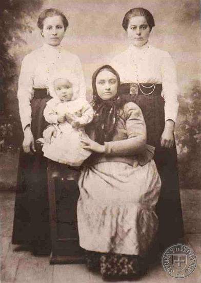 Stoją Józia Sawicka - córka Grzegorza i Urszuli i jej siostra cioteczna Frania - córka Celestyny?, siedzi Urszula Sawicka i synek Józi - Antoni,