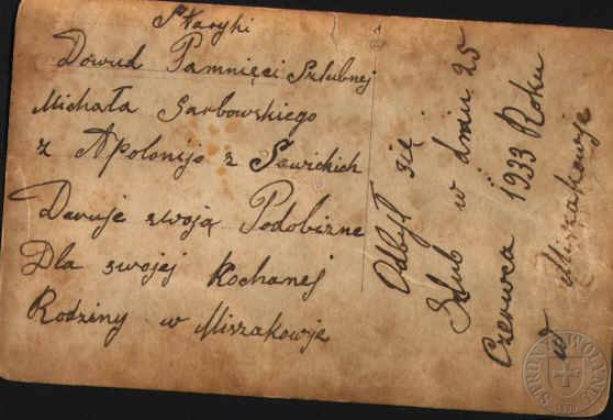 Dedykacja na odwrocie zdjęcia ślubnego Michała Garbowskiego z Apolonią Sawicką