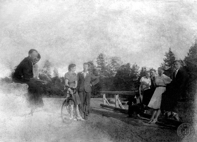 rowerem Bronisława Wrześniewska. Po prawej stronie, w białej sukni Janina Wrześniewska.