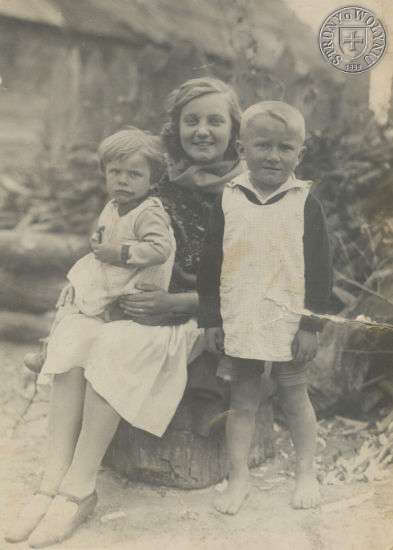 158. Hela Kokot z d. Widmańska na kolanach trzyma Zosię Roczniak obok stoi Marian Roczniak, 1930-31