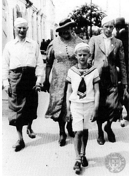 Od lewej nauczyciele: Leonard Bieńkowski z Okopów, Felicja Masojada z Okopów, Ignacy Mikołajczak z Budek Borowskich. Na pierwszym planie Dzidek - wówczas Edmund Masojada.