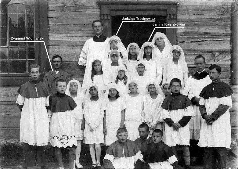 <<< | Zdjęcie wykonane przy kościele, przy wejściu bocznym; kościół przed rozbudową. Na zdjęciu: ks. Stanisław Fijałkowski (przy wejściu), Zygmunt Widmański, Jadwiga Trzcinowicz, Janina Krysiakówna i druga od prawej Helena Dytkowska, w pierwszym rzędzie (za ministrantem widoczna tylko głowa) Anna Talmówna (do poszukania myszką). | >>> |
