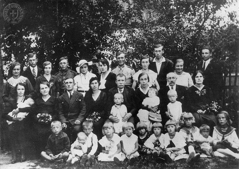 Na zdjęciu od lewej stoi: Stefania Widmańska; Witek Widmański; Helena Widmańska (żona Leona); Leon Widmański; Helena Widmańska (po mężu Musiał); Maria Widmańska (żona Wacława Widmańskiego); Wacław Widmański; Ewa Widmańska; Kazimierz Widmański; Dusia Widmańska; (?); Siedzą od lewej: Maria Widmańska (żona Władysława) z synem Jakubem; Maria Widmańska (żona Zygmunta); Zygmunt Widmański; Władysława Widmańska (nazwisko panieńskie); Franciszek Widmański na rękach syn Władysława Widmańskiego - Marian; Emilia Widmańska (żona Franciszka) na rękach córka Kazimiera; Antoni Widmański na rękach syn Władysława (?); żona Antoniego Julia (?) Widmańska: Siedzące dzieci: Henryk syn Aaszka; Stanisław syn Antoniego z córką Władysława - Barbarą; córka Wacława Widmańskiego - Danuta; Maria córka Franciszka; Krystyna córka Wacława Widmańskiego; Grażyna córka Leona Widmańskiego; Alfreda( Dziunia) córka Leona Widmańskiego; Jadzia córka Antoniego; (?); Irena córka Antoniego. Czcionką pochyłą zaznaczone rodzeństwo (bracia i siostry Widmańscy). Uzupełnienie Tomasz Wółkowski, mail: vooth@poczta.onet.pl, Źródło: Relacja matki Alfredy Wółkowskiej c.Leona i Heleny z d.Filarowskiej. |