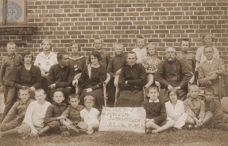 | Górny rząd, od lewej: Konstanty Siniakiewicz (Antolin), Leontyna Kuriata (Jackowicze), Tamara Siniakiewicz (Antolin), Włodzimierz Sztandara (Antolin, lub Gajderowicz z Białaszówki), Stefan Sztandara (Antolin), NN, Agata Siniakiewicz (Antolin), NN, Ewa Piotrowicz (Antolin). Rząd siedzący, od lewej: Nadia Korolczuk (nauczycielka, Ukrainka), ksiądz NN, Genowefa Brodecka (nauczycielka, żona dyrektora szkoły), ksiądz Faustyn Lisiecki (proboszcz w Rudni Potaszni), pop Danił Ostaszewicz (z Hotynia), Stanisław Brodecki (dyrektor szkoły). Dolny rząd, od lewej strony: NN, prawdopodobnie Feliks Czyżewski (Antolin), NN, NN, Zbigniew Brodecki (syn dyrektora), NN, NN, NN, Wasil Kowalczuk (późniejszy ataman banderowców). Własność – Ewa Pawęska z d. Kuriata | |