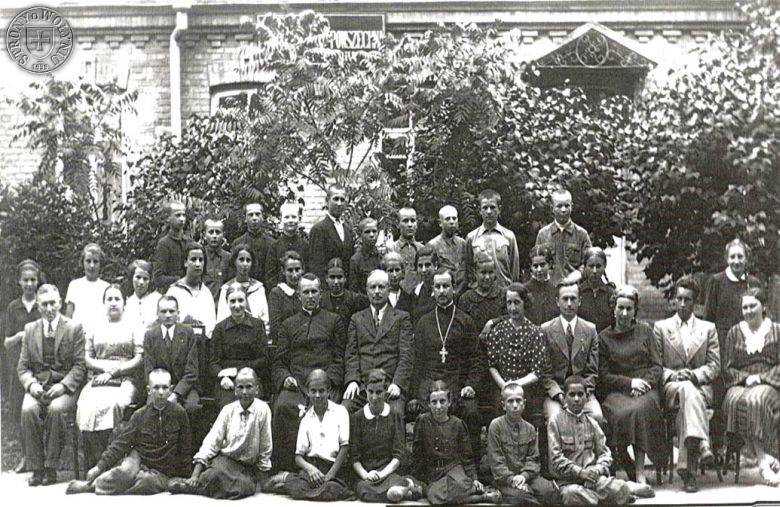 <<< | Od lewej siedzą nauczyciele: Kalt, Ewa Fefeberg, Sośnicki, Zofia Walterówna, ks. Faustyn Lisicki, Andrzej Demidiuk - kierownik Szkoły, prawosławny Ksiądz Melechowicz, Apolonia Gawęda, Władysław Dachowski, Brudzianowa, Hamulewicz, Wilhelmina Dachowska. | >>> |