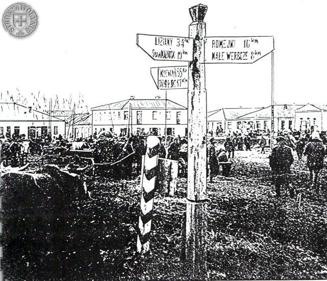 4. Słupek kilometrowy w centrum miasteczka.