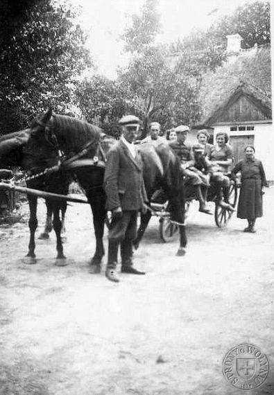 Stoją: babcia Tekla, dziadek Antoni, na wozie: Władek, Bolek, Kostunia, Hela Bogusławscy.