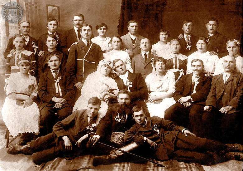 | Osoby rozpoznane: za panną młodą, w białej bluzeczce i z włosami „w kitki”, jej starsza siostra Maria Dziubińska z Cieślaków. W ostatnim rzędzie: pierwszy od prawej - starszy brat panny młodej, Augustyn, z kuzynem Antonem Bauerem; czwarty z kolei –Teofil Stranc (sąsiad). W przedostatnim rzędzie: pierwsza od prawej – Marynia Entfleisch (sąsiadka) i w dalszej kolejności trzecia - Marianna Dziubińska (szwagierka Marii Dziubińskiej). Brodacz w pierwszym rzędzie - Orbliś. Fotografię wykonano przed rokiem 1925. Własność rodziny Augustyna Cieślaka. | |
