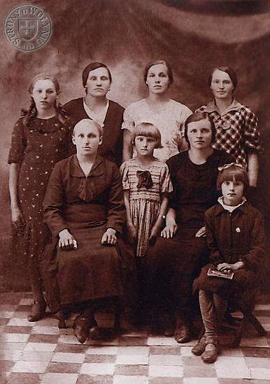 <<< | W pierwszym rzędzie druga od prawej – żona Augustyna Cieślaka - Józefa, pierwsza od lewej - Marynia Entfleisch. W drugim rzędzie od prawej Antonina Klek, następnie jej siostra Franciszka - żona Antoniego Cieślaka, Dobrakowska (mieszkanka Kurdybana Warkowickiego - gościnnie). Fotografia wykonana około roku 1930. Własność rodziny Augustyna Cieślaka. | >>> |