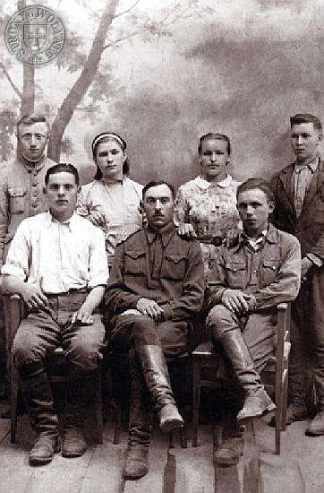 <<< | Siedzi pośrodku Augustyn Cieślak – żegnający młodzież, obok jego syn, Franciszek (w białej koszuli) i Andrzej Ogar. W drugim rzędzie od lewej: Stanisław Czubkowski, Hanna Stranc, Zofia Klek i Mikołaj Zakalewicz (Ukrainiec). Fotografię wykonano w czerwcu 1942 roku. Własność rodziny Augustyna Cieślaka. | >>> |