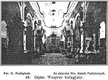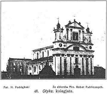 Kolegiata św. Trójcy w Ołyce jest najpiękniejszym kościołem Wołynia. Jest to barok o dwóch niskich wieżach na froncie, budowany w latach 1635 - 40 kosztem ks. Albrechta St. Radziwiłła, wedle proj. Jana Maliwerny i Jezuity Benedykta Molli z Rzymu. Przy budowie współdziałali Bączkowicz, Grzegorzewicz, P. Markowicz, W. Sadowski, oraz R. Befka. Ołtarze grobowce rzeźbił Almpech, roboty stolarskie wykonywał Niemiec Walde.Założenie trzynawowe bazylikowe, prezbiterjum zakończone półkolisto z obejściem chóru. Fasadę zdobią kapitele z ciemnego piaskowca, oraz bardzo słabego dłuta rzeźby świętych: Wojciecha, Stanisława (jako patronów fundatora), oraz Piotra i Pawła. Nad gzymsem rzeźba Boga Ojca uszkodzona w czasie wojny, wyżej duża płaskorzeźba M. Boskiej. Pierwotnie miała kolegiata miedziany dach, który w r. 1916 zdarli Rosjanie. Wewnątrz ściany białe z bardzo skromną ornamentyką. Ściany nawy i prezbiterjum zdobią pilastry, na których stoją złocone rzeźby 12 apostołów słabego dłuta. W nawie u góry ładne obrazy z XVII wieku ze scenami z życia M. Boskiej, odnowione przez Pochwalskiego. Słabego dłuta są też płaskorzeźby aniołów ze stiuku umieszczone nad łukami do naw bocznych. Organy barokowe, dużo, bogato złocone. Ołtarze pięknie rzeźbione z marmuru i alabastru, wczesnobarokowe, dłuta Melchiora Ellenberga (Almpecha czyli Almpeciusa) ucznia Pfistera ze Lwowa. Jego dłuta są też stalle kanoników w prezbiterjum, z połowy XVII w. W ich zapleckach obrazy o małej wartości artystycznej. Ołtarze, jak również grobowce, pochodzą z czasów budowy kościoła, w ołtarzach obrazy dość słabego pędzla. Najbardziej artystycznie przedstawia się ołtarz Ukrzyżowania z czarnego marmuru w prawej nawie. Pierwotny wielki ołtarz wczesnobarokowy wywieziono przed wojną, podobno do Pińska, a wstawiono nowy z białego marmuru, przywieziony z Rzymu, nie harmonizujący z otoczeniem. W prezbiterjum nad wejściem do zakrystji wisi portret fundatora, kanclerza ks. Albrechta Radziwiłła, naprzeciw jego ojca Stanisława, marszałka w. ks. Litewskiego. Na lewo od wielkiego ołtarza wisi na ścianie prezbiterjum cenny obraz Zwiastowania z XV w. prawdopodobnie kolońskiej szkoły, darowany przez Radziwiłłów.Kolegiata posiada liczne grobowce, ks. Radziwiłłów i kanoników, ustawione przeważnie w czasie jej budowy. Niestety w czasie wojen kozackich wszystkie uległy uszkodzeniu. W prezbiterium po jednej stronie grobowiec proboszcza ołyckiego Franciszka Zajerskiego (+ 1631) z późnorenesansową postacią zmarłego z alabastru, zaś po drugiej stronie również późnorenesansowy alabastrowy grobowiec ks. Stanisława Udryckiego (+ 1621). Na filarach nawy głównej renesansowe grobowce z kolorowego alabastru, z postaciami niemowląt poświęcone są pamięci młodo umarłych synów marszałka wielkiego koronnego Stanisława Radziwiłła (1590) a braci fundatora kolegiaty, w szczególności Stanisława (+ 1590), i zmarłego w kilka lat później Jerzego, Wykonane są przez tego samego nieznanego rzeźbiarza. Nadto w nawie głównej umieszczone są epitafia ks. Tomasza Bolimowskiego (+ 1642) kanonika ołyckiego i ks. Wojakowskiego (+ 1641), duchownych miejscowych z czasów budowy kolegiaty.