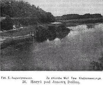 Obok stacji stoi też duży tartak, własność spółki akcyjnej. Przerabia on drzewo z dużych mieszanych lasów ciągnących się na północ od Klewania. Prowadzi przez nie droga do Deraźna.7 km. na zachód od stacji na północ od toru kolejowego leży Orżów, z dużym tartakiem, niegdyś Blocha, obecnie angielskiej spółki akcyjnej, 4 km. na północ Susk, gdzie znajduje się 1 km. długi drewniany most na Horyniu, zbudowany w czasie wojny.8 km. na południe od Klewania, nad Stubłem, leży Żuków Stary. Za wsią na wzgórzu niewielkie ruiny zamku, który w r. 1516 Zygmunt I nadał Bohuszowi Bohowitynowi, a który później należał do Prońskich i Czartoryskich. Stąd pisali się oni książętami na Klewaniu i Żukowie. W XIX w., wraz z Klewaniem przeszły dobra na rząd rosyjski. Cerkiew drewniana z r. 1731 w r. 1876 odrestaurowana.W sąsiedztwie Peresopnica, obecnie wieś, w XII i XIII w. jeden ze znaczniejszych grodów Wołynia, stolica udzielnego księstwa. W r. 1240 gród zniszczyli Tatarzy, to co pozostało, zniszczyli w 6 lat później Litwini. W r. 1319 przyłączono księstwo Peresopnickie do Litwy. Dobra tutejsze Aleksander I nadał w r. 1501 Czartoryskim, ci zaś w r. 1630 jako uposażenie proboszczowi łacińskiemu w Klewaniu, do którego dobra należały do 1848 r. kiedy je skonfiskował rząd rosyjski. Od XV w. istniał tu bogaty monaster żeński. Wieś leży nad dużym stawem, podobnie jak położone 6 km. dalej na południe Humienniki, wieś z kaplicą murowaną z r. 1797. Obok Płoska z drewnianym kościołem z r. 1776.16 km. na północ od Klewania leży Deraźno, miasteczko o 1000 m. przeważnie żydów, położone w piasczystej okolicy, bogatej w lasy. Niegdyś należało do ordynacji ks. Ostrogskich, w XVIII w. Lubomirskich, w XIX w. Podhorodeckich, poczem dobra przeszły w ręce rosyjskie. Kościół empirowy z r. 1804 fundacji Podhorodeckich, skromny budynek o dwóch wieżach. Dawny dwór Podhorodeckich zniszczyły wojska rosyjskie w r. 1915. Pozostał tylko piękny i duży park Miklerowski na północ od miasta.Stary cmentarz prawosławny został w r. 1915 zniszczony przez żydów. Deraźno leży nad Horyniem na lewym brzegu rzeki. Tworzy on tu oryginalną pętlę, oblewając dokoła wzgórze zwane Obszarem, po opłynięciu którego łukiem, zataczającym prawie całe koło o długości kilkunastu kilometrów, zbliża się znowu na 1/4 kilometra do poprzedniego koryta. Przypomina to pętlę Smotrycza pod Kamieńcem Podolskm. U początku owej pętli leży, wieś Dziuksyn z cerkwią drewnianą z r. 1775 fund. hr. Chodkiewiczów. Są to dawne dobra Dorohostajskich, ostatnio Strojnowskich, których dwór z r. 1850 został w r. 1915 częściowo zniszczony przez wojska rosyjskie. Okolice Deraźna i Dziuksyna słynęły niegdyś z bobrów. Wsie w okolicy Deraźna odznaczają się ładnymi chatami drewnianemi, krytemi słomą. Zachowały się tutaj jeszcze piękne stroje ludowe, noszone przez kobiety jak np. w Biczalu.8 km. na północ z Deraźna Jałowica , gdzie dwór empirowy Zofji Wydzgowej z r. 1800 uległ w r. 1915 zupełnemu zniszczeniu przez Rosjan.Z Dereźna można tak zwanemi polskimi drogami dojechać (w suchej porze roku nawet autem) do głośnych kamieniołomów bazaltu w Berestowcu i Janowej Dolinie, (p. niżej). Po drodze mija się wieś Złaźno (14 km.) pięknie zabudowana drewnianymi domami, a za nią przekracza rzekę Horyń po drewnianym moście, tuż za którym leży rewir leśny Janowa Dolina, z pokładami bazaltu, Horyń tworzy w tym miejscu malowniczą dolinę wśród wysokich, częściowo urwistych brzegów porosłych lasami.
