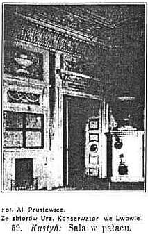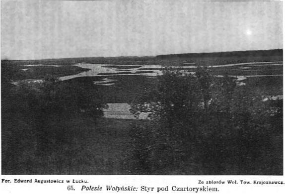 Po za obrębem zamku stał pałac Worcelów z końca XVIII w., z którego pozostała tylko okrągła wieża zegarowa. Koścół empirowy o krzyżowem założeniu fundował w r. 1806 hr. Stanisław Worcel. Stary cmentarz. Dwie cerkwie drewniane z XVIII w. mają oryginalne opasanie na balasach. Pod miastem mogiły kryjące zwłoki poległych w bitwie wojsk Augusta II i Piotra Wielkiego z Karolem XII. 4 km, na południe Pohulanka, gdzie zachowały się dwa pomniki ceglane z XVI w., nieznanego pochodzenia. 15 km. na zachód Myck z cerkwią drewnianą z r. 1759, fundacji Dzierzbickich. Za Małyńskiem opuszcza pociąg granice obecnego województwa wołyńskiego a wkracza w należący dopiero od nie dawna do województwa poleskiego powiat sarneński. Niemowicze (72 km.) stacja wśród lasów i bagien, oddalona 9 km. na zachód od wsi tej nazwy, która leży nad Słuczą. Dokoła stacji bezludne lasy z nielicznemi smolarniami i leśniczówkami, wśród nich rozległe, częściowo nagie bagna Małuszka, Orłowo, Wieprzyk, po kilka a nawet kilkanaście kilometrów długie i tyleż szerokie. Wieś Niemowicze położona 9 km. na północny wschód od stacji niedaleko toru kolejowego do Sarn, leży nad Słuczą. W tem miejscu płynie ona wśród łąk i bagien, częściowo zalesionych kilkunastu ramionami, które ogółem zajmują szerokość 8 km. Wieś o 1500 m. posiada mały kościół barokowy, który jest miniaturą bazyliki św. Piotra w Rzymie, oraz cerkiew drewnianą z r. 1881. W kościele obrazy Cyprjana Pruszyńskiego. Łandudy staropolski dwór drewniany.20 km. na wschód od stacji nad Słuczą leży Tynno, z cerkwią drewnianą z r. 1754, i pałacem Małyńskich, który w jesieni 1917 r. został doszczętnie zniszczony przez ludność miejscową. Sarny (90 km.) stacja węzłowa z linją Kowel- Ostki. Strzelsk (100 km.) wieś o 2.000 m. z cerkwią drewnianą z r. 1829; dawne dobra Pijarów z Dąbrowicy. 10 km. na zachód nad Horyniem miasteczko Bereżnica, położone przy ujściu Bereżanki. Są to dawne dobra Ostrogskich, na mocy transakcji kolbuszowskiej w r. 1753 nadane z 6 wsiami okolicznemi Czackim, w r. 1831 skonfiskowane przez rząd rosyjski. Kościól barokowy z r. 1726, fundacji Bogusława Skirmunta, posiada cudowny obraz M. Boskiej, koronowany. Cerkiew drewniana, cztery synagogi i garbarnia. W okolicy wiele kurhanów. 4 km. na wschód z Bereźnicy, również na lewym brzegu Horynia, który płynie tu wśród szerokich na 2 km. bagnistych łąk, leży Kuraż, wieś z cerkwią drewnianą i kaplicą katolicką z r. 1815. Dąbrówka (115 km.) Stacja leży w klinie między Horyniem a Słuczą. Miasteczko zwane do niedawna Dąbrowicą Wołyńską, leży 3 km. na zachód od stacji nad Horyniem. Ma 6.000 mieszk. przeważnie żydów, hotele: M. Gotliba, S. Gotliba, R. Gidengora, i S. Genzela, wszystkie w Rynku. Restauracje: B. Motoryna, S. Gromera w rynku. Kawiarnie; R. Detynko i Giersteina, w rynku. Jest to stary gród, który w XIII w. był stolicą książąt ruskich. Z książąt Dubrowieckich XII i XIII w. znani są ks. Hleb Jurjewicz i ks. Aleksander, który w r. 1224 poległ, w bitwie z Tatarami nad Kałką. Po najeździe tatarskim księstwo dubrowieckie zagarnęła Litwa, a w końcu XV w. otrzymali je ks. Holszańscy z Litwy, spokrewnieni przez matkę z Kazimierzem Jagiellończykiem. Linja tutejsza pisała się ks. Holszańskimi-Dubrowieckimi. Ogromne dobra prócz Dąbrowicy obejmowały Wysock, Stolin, Strzelsk, Kurasz, i Sechów, (późniejszy Tomaszgród). W r. 1502 po klęsce nad Uszą wpadli do Dąbrowicy Tatarzy i splądrowali zamek i miasto. Po wygaśnięciu Holszańskich w r. 1558 dobra przeszły na Firleyów, Sapiechów, Dolskich, od połowy XVIII w. Scypionów, wreszcie Broel-Platerów. Za czasów bolszewickich utworzyła się tutaj republika dubrowicka a w czasie jej rządów uległy zniszczeniu okoliczne siedziby magnackie w szczególności pałac Platerów w Worobinie.Do rozbioru Polski Dąbrowica należała do województwa brzesko-litewskiego, a dopiero w r. 1805 wraz z Wysockiem przyłączono ją do guberni wołyńskiej. Wówczas miasteczko było dobrze zabudowane, miało fabryki, i słynne szkoły Pijarów. Tutejsze kolegjum Pijarów fundował w r. 1695 Jan Dolski, marszałek w. ks. lit. W miejsce pierwotnego drewnianego, zbudowano w r. 1740 staraniem rektora Kazimierza Pniewskiego wspaniały kościół rokokowy ozdobiony kilkunastu obrazami Pijara Łukasza Hübla z poł. XVIII w. Po kasacie kolegjum w r. 1832 kościół zamieniono na farny. Ucz niami tutejszych szkół pijarskich między innymi byli Cyprjan Godebski, Aloizy Feliński i Łukasz Gołębiowski. Na cmentarzu kaplica murowana z r. 1767. Pozatem posiada Dąbrowica dwie cerkwie, jedną murowana z r. 1861, fundacji hr. Ignacego Platera, i drugą drewnianą z r. 1872, oraz trzy synagogi. Mieszczanie tutejsi trudnią się przeważnie szewstwem i krawiectwem. W okolicy w podkładach gliny znachodzi się bursztyn.3 km. na północ z Dąbrowicy leży Worobin, gdzie przed wojną był piękny pałac hr. Platerów, ze zbiorami sztuki i wzorowe gospodarstwo. Było tu też bogate archiwum Platerów, pełne dokumentów z XVIII w. Ozdobą galerji był obraz M. B. Bolesnej, przypisywany Domenichinowi. Przy pałacu była kaplica katolicka z r. 1772. W r. 1917 w czasie rozruchów bolszewickich został pałac doszczętnie zniszczony przez ludność miejscową.2 km. na wschód między Sielcem a Worobinem stoi wśród bagien dawny monaster Puszczański. W miejscu tem w r. 1502 na niedostępnym ostrowie ukryła się w czasie najazdu tatarskiego żona ks. Jerzego Holszańskiego, który na pamiątkę jej ocalenia fundował tutejszy klasztor. Pozostała po nim niewielka cerkiewka z cudownym obrazem św. Mikołaja, dokąd na odpusty zbiegają się rzesze ludu. Na zachód od Dąbrowicy wieś Granice (Grań), której nazwa ma być pamiątką dawnych granic ziem Drewlan i Dregowiczan.W okolicach Sarn i Dąbrowicy są wyraźnie zaz