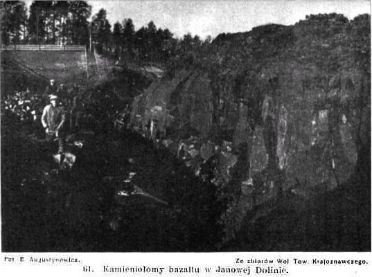 Pola kryjące tomy bazaltu należą częściowo do miejscowych chłopów, a częściowo do obszaru dworskiego Madeyskiego. Już za czasów rosyjskich prowadzono tu eksploatację bazaltu na niewielką skalę, przyczem było tu zajętych około 100 osób. Na większą skalę zaczęła się ta eksploatacja dopiero po wojnie, gdy "Towarzystwo Eksploatacji Kamieniołomów" z Krakowa wydzierżawiło tereny bazaltowe należące do Madeyskich i przystąpiło do intenzywnej pracy, opartej o znaczne kapitały. W r. 1927 było tu zajętych 400 robotników, którzy produkowali miesięcznie około 10.000 tonn bazaltowych kostek i szutru, a wartość roczna tej produkcji wynosiła 1.400.000 złotych. Zwiedzanie kamieniołomów i pracy przy obrabianiu bazaltu jest możliwe każdego czasu za pozwoleniem zarządu. Wycieczki zbiorowe, w szczególności wycieczki szkolne, które chciały by tu przybyć dla zwiedzenia kamieniołomów, winny uprzednio listownie zawiadomić o tem zarząd kamieniołomów, podając pociąg, którym przybędą do Lubomirska, a to w tym celu, aby dodano wóz do pociągu kolejki wązkotorowej, kursującej do Berestowca i dostosowano odpowiednio jego rozkład jazdy. Listy należy adresować Zarząd Kamieniołomów w Berestowcu, o. p. Kostopol. Wśród lasów na północ od Berestowca na prawym brzegu Horynia występują jeszcze większe pokłady bazaltu przy północnym końcu soczewki bazaltowej w rewirze leśnym Janowa Dolina (p. niżej). W okolicy Berestowca liczne kolonje niemieckie. W dalszym ciągu biegnie pociąg przez poleskie bagna i lasy. Leży wśród nich Kostopol (34 km.) miasto powiatowe o 1600 mieszkańcach założone w r. 1792 przez kuchmistrza koronnego Leonarda Worcela. Od r. 1922 jest Kostopol miastem powiatowem dla północnej części dawnego powiatu rówieńskiego. Wśród miast wołyńskich należy on do najczystszych, a w ostatnich latach powstało dużo nowych dworków w zakopiańskim stylu. Mieszka tu pewna ilość Niemców ewangelików, którzy tu mają kościół ewangelicki. Duża huta szklanna, oraz fabryka wyrobów dychtowych (forniernia). Niegdyś dobywano tu rudę poddarniową, ale obecnie przemysł żelazny w okolicy upadł. W okolicy (10 km. na zachód) Lubasza Wielka, gdzie już w XVIII wieku była słynna huta żelaza, przekształcona w XIX wieku na fabrykę wyrobów żelaznych. Jest to dawna własność Ostrogskich, później Czartoryskich, którzy rozwinęli tutejszy przemysł żelazny. Obok Podłużne, niegdyś centrum klucza Radziwiłłów, sprzedanego w XIX wieku wraz z kluczem klewańskim przez księżnę z Radziwiłłów Czartoryską rządowi rosyjskiemu. W kościele empirowym fundacji ks. Michała Radziwiłła z pocz. XIX wieku, groby Radziwiłłów tutejszej linji. Dalej na północ Kosmaczów, wieś nad Horyniem z cerkwią drewnianą z r. 1775, fundacji Józefa Grocholskiego. 18 km. na zachód od Kostopola leży Janowa Dolina, rewir rządowy leśny z ładnym lasem mieszanym, położony na prawym brzegu Horynia, na przeciw wsi Złaźno. Znajdują się tutaj duże pokłady bazaltu stanowiące jedną całość z pokładami bazaltowymi w Berestowcu. Z powodu braku dróg pokłady te należące do rządu nie były do niedawna eksploatowane. Eksploatacja rozpoczęła się dopiero po budowie normalnotorowej kolei lokalnej z Kostopola w r. 1929. Cały teren w pobliżu Horynia obejmuje zgórą 100 ha i jest lakolitem. W 1925 r. z polecenia M.R.P. przystąpiono do szczegółowych zdjęć - stwierdzono pokłady bazaltu i w październiku 1928 roku poczęto eksploatować bazalt. Kierownictwo spoczywa w rękach Pana Inż. Leonarda Szutkowskiego pod którego też kierunkiem odbyły się pierwsze odkrywki pokładów. Eksploatowany bazalt z Janowej Doliny jest drobnoziarnisty, posiada regularną łupliwość, złoża odkryte posiadają graniastosłupy prostopadłe do poziomu. Przeciętna wysokość słupów do ponad 18 mtr. średnica od 85 do 100 cm. Przewidziana eksploatacja na rok 1930/31 do 150000 tonn i zatrudnia w obecnym czasie 1000 robotników. Dzienna eksploatacja wynosi do 700 tonn.