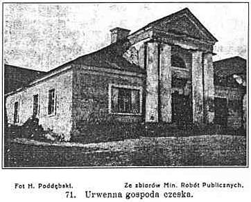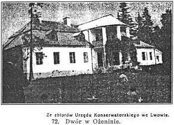 7 km. na północ Koleśniki . Koleśniki, wieś nad Horyniem w 1503 r. jako wiano Maruszy ks. Ostrogskiej, córki Michała Ostrogskiego (brata Konstantego) przechodzi do rąk Macieja Jełowickiego razem z Ożeninem i Stadnikami, które do ostatnich czasów w rękach tej rodziny pozostają (Słow. Geogr. Ziem Pol. i Arch. Rodz.). W pierwszej połowie XIX w. założony tu został ogród botaniczny przez znanego ogrodnika Miklera. Kościół katolicki filialny do Tajkur.8 km. na zachód z Ożenina, Płoska, dawne dobra ordynacji ks. Ostrogskich po r. 1753 kanclerza w Kor. Małachowskiego, w r. 1794 podobnie jak Korostowo i Michałpol skonfiskowane przez rząd rosyjski i nadane gen. Fersenowi. W r. 1802 dobra kupili Ilińscy, w r. 1825 Czetwertyńscy. Nad stawem okazały pałac, w dużym parku, zbudowany w połowie XIX w. przez ks. Eustachego Cze twertyńskiego. W czasie wojny został on zrujnowany. Cerkiew drewniana z r. 1877.12 km. na południe z Ożenina leży Ostróg (p. niżej). (38 km.) polska stacja graniczna, wieś położona na prawym brzegu Horynia. Nazwa pochodzi od licznych mogił, które obecnie pozarastały starymi drzewami. Mogiły liczne, spotykane wzdłuż Horynia od Wielbowna po Moszczarnicę mają wedle jednych pochodzić z walk ks. Ostrogskiego z Tatarami, a wedle drugich z czasów wojen kozackich. Mogilany są to dawne dobra Ostrogskich, później Chodkiewiczów, w połowie XVII w. zapisane Jezuitom z Ostroga, w XIX w. Jabłonowskich, w r. 1875 przeszły na Rosjan. Cerkiew drewniana z r. 1794. Okolica czarnoziemna jedynie wzdłuż Horynia ciągnie się pas piasków, wśród których leży sama wieś.3 km. na południe Kurhany, wieś której nazwa pochodzi również od kurhanów, które ciągną się stąd aż po Mogilany. Pośrodku wsi stary cmentarz unicki, zniszczony przez ludność miejscową, gdzie zostały też tylko dwa krzyże kamienne. Na Horyniu drewniany most z czasów wojennych, najdłuższy na Wołyniu, mający blisko 2 km. długości, przez który prowadzi droga do Ostroga. Wzniesiono go nad łąkami nadrzecznemi, które są zalewane w czasie powodzi wiosennych. 6 km. na wschód z Mogilan Moszczanica, do r. 1622 dobra Chodkiewiczów, później dzieliły losy Mogilan. Wieś leży na wzgórzu, na którym zachowało się pięć mogił, wedle legendy kryjących zwłoki poległych w bitwie ks. Konstantego Ostrogskiego z Tatarami w r. 1508. We wsi, która rozrzucona jest na dwóch wzgórzach pałac z połowy XIX w. zbudowany przez ks. Władysława Jabłonowskiego. W środku wsi wał po starym grodzisku, drugi znacznie większy wał czworoboczny obsadzony lipami ciągnie się na wschód od folwarku. Wały te częściowo zaorano jeszcze przed wojną, częściowo w czasie przewrotów politycznych w r. 1917-18. Obok kolonja czeska tej samej nazwy z piwiarnią. 6 km. na północ z Mogilan Milatyn, duża wieś rozrzucona na kilku wzgórzach, ciągnąca się na przestrzeni 6 km. od zachodu ku wschodowi. Są to dawne dobra Firleyów, później Krzyżanowskich, w XIX w. podzielone na kilka folwarków. W środku wsi był jeszcze w XVIII wieku zamek pieknie położony na wzgórzu nad wąwozem. Pozostały po nim tylko reszki wałów, a na jego miejscu stoi obecnie dwór. Pozatem wśród parków zw pięknem położeniu stoi tu jeszcze osiem dworków posiadaczów poszczególnych folwarków. Wieś ma kościół drewniany z XVII wieku, dwie cerkwie i młyn. 8 km. za Mogilanami przekracza pociąg granicę polsko-bolszewicką.