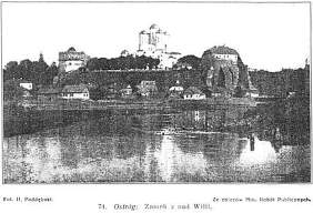 Ostróg jest obecnie miastem granicznem oddalonym zaledwie 1 km. od granicy polsko-rosyjskiej, która przebiega na wschód od miasta za przedmieściem Nowy Ostróg przez moczarowate łąki i lasy między Horyniem a Wilją. (Ruch graniczny). Miasto należy do najczystszych na Wołyniu, a przy bocznych ulicach posiada dużo dworków wśród ogrodów. Ze szkół ma Ostróg gimnazjum im. Konopnickiej, seminarium nauczycielskie i szkołę rzemiosł. Główną ulicą miasta jest długa ulica Dubieńska, przecinająca miasto od zachodu ku wschodowi. Stoją przy niej wszystkie większe hotele i restauracje, znajdują się ważniejsze sklepy. Przy górnym końcu ulicy na wzgórzu nad miastem stoją duże koszary. Na wzgórzu nad Wilją dominują dotychczas wyniosłe baszty i mury dawnego zamku ks. Ostrógskich. Niegdyś była to iście królewska rezydencja, odpowiadająca zamożności i znaczeniu senatorskiego rodu. Pierwotny gotycki zamek został założony przez Daniela, księcia na Ostrogu (+ 1386) w połowie XIV wieku na dawnem grodzisku na Sądowej Górze.W 100 lat później rozszerzył go i przebudował ks. Wasyl Ostrogski, zwany Pięknym, (+ 1450) hetman wielki lit., ks. Konstanty Iwanowicz Ostrogski (+ 1533) wpocz. XVI w. wzniósł nowy murowany zamek, z którego do dziś zachowała się jedna część, gdzie niegdyś miał się znajdować skarbiec książęcy. W XVI w. wsławił się zamek Ostrogski tragedją Halszki, z Ostroga (1580) córki Beaty Kościeleckiej i ks. Eliasza Ostrogskiego, a dotychczas pokazują w zachowanej części zamku okno od wschodniej strony, przez które ks. Dymitr Sanguszko, najechawszy zbrojno z ks. Bazylim Ostrogskim, jej stryjem, wykradł Halszkę. W końcu XVI i pocz. XVII w. za władania ks. Konstantego II Ostrogskiego (+ 1606) poddano zamek przebudowie w stylu renesansowym i z tego czasu pochodzi renesansowa attyka zachowanej baszty. Po wygaśnięciu ks. Ostrogskich w r. 1620, zamek przestał być rezydencją nowych dziedziców, których rzadko oglądał w swych murach, dzięki czemu popadł w zaniedbanie. W r. 1648 został zniszczony i splądrowany przez Kozaków. Po r. 1863 ruiny skutkiem konfiskaty dóbr ks. Jabłonowskich przeszły na rząd rosyjski, po którym odziedziczył je rząd polski. Do r. 1910 opiekowało się zamkiem Kijowskie Tow. Opieki nad Zabytkami, później Bractwo im. ks. Ostrogskich, z którego inicjatywy został zamek w r. 1914-15 odrestaurowany kosztem apanażów. Po dawnym zamku pozostała tylko niewielka piętrowa budowla, o wyglądzie kwadratowej baszty podparta potężnymi szkarpami, mająca od strony Wilji trzypiętrowe podmurowanie. Przy wejściu od dziedzińca gotycki portal. W podziemiach tej budowli mieszczą się dawne więzienia. Podziemia te mają dwie kondygnacje; w górnej mieści się obecnie archiwum miejskie, dolna, która zachowała ładne gotyckie sklepienie, stoi pusta. Na piętrze pomieszczono w 5 komnatach muzeum historyczne im. ks. Ostrogskich. Założone w r. 1915 posiada wiele portretów ks. Ostrogskich, starych dokumentów, planów, widoków zamku i miasta, wykopaliska starosłowiańskie, zabytki kultu religijnego, obrazy i t.d. W jednej z sal ładny portal renesansowy. Z ganku piękny widok na Wilję, położone za nią przedmieście Nowy Ostróg i lasy za granicą sowiecką. Muzeum otwarte jest w niedziele, wtorek, czwartek i sobotę od 11-l i 3-6, dla wycieczek zamiejscowych także w innej porze za zgłoszeniem.