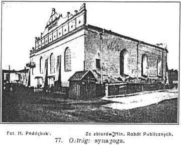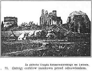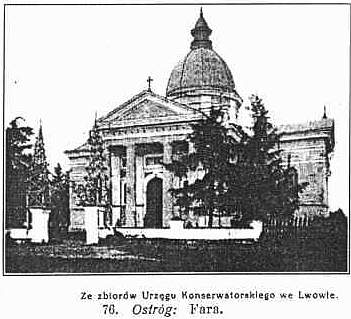Na sąsiedniem wzgórzu, na dawnem Podwa lu, stoi kościół farny. Został on fundowany w pierwszej połowie XV wieku przez ks. Fiedora Ostrogskiego jako kościół Dominikanów. Od r. 1617 przeszedł na Bernardynów, a po ich kasacie za rządów rosyjskich został zamieniony na kościół farny. 4 czerwca 1889 przy pożarze miasta spłonął, a na jego odbudowę pozwolili Rosjanie dopiero w r. 1896 z zastrzeżeniem, że kościół otrzyma zupełnie inny kształt, niż poprzedni barokowy. Odbudowano go w ciągu kilku miesięcy w r. 1897 wedle proj. arch. Wiktora Piotrowskiego, spiesząc się w obawie cofnięcia pozwolenia. Kościół otrzymał wygląd klasyczny z kolumnadą dorycką od frontu i kopułą. Z ołtarzów ocalał od pożaru jedynie ołtarz M. Boskiej w prawej nawie, który zdobi rzeźba M. Boskiej z białego marmuru dłuta Oskara Sosnowskiego. W lewej nawie w ołtarzu św. Antoniego umieszczono w antepedjum piękną rzeźbę Sosnowskiego z białego marmuru Chrystus w grobie, zazwyczaj zasłoniętą. Nowe ołtarze i ambonę rzeźbił Iglatowski z Romanowa. W wielkim ołtarzu krzyż z dawnego kościoła Jezuitów. Na cmentarzu kapliczka rokokowa z rzeźbą M. Boskiej przy grobie łuckiego biskupa ks. Komarnickiego (+ 1798).Między zamkiem a kościołem stały gmachy, w których mieściła się słynna dla wyznawców wschodniego obrzą dku przez Ostrogskich w XVI w. utrzymywana, akademja ostrogska wraz z drukarnią. Zostały one zniszczone przez Kozaków w r. 1648. W drukarni tej odbito w r. 1581 pierwszą biblję słowiańską-egzemplarz tego wydawnictwa posiada cerkiew zamkowa.Ostróg posiadał niegdyś kościół Jezuitów, których kolegium fundowała w roku 1624 ks. Anna Ostrogska i jej córka hetmanowa Anna z Ostrogskich Chodkiewiczowa. Kolegium to uposażone przez fundatorki miasteczkiem Surażem i 23 wsiami było najbogatszym klasztorem na Wołyniu. Jezuici tutejsi prowadzili w Ostrogu kolegium dla szlachty. Posiadali oni piękny kościół, wzniesiony w r. 1624 przez włoskiego architektę Benedykta Molli, twórcę kolegiaty w Ołyce. Byt to gmach wczesnobarokowy, krzyżowy, ozdobiony kopułą. Po kasacie Jezuitów w r. 1773 oddano kościół i klasztor Bazylianom z warunkiem prowadzenia w dalszym ciągu szkół jezuickich. Po rozbiorze Polski w r. 1795 usunięto Bazylianów, kościół zamieniono na cerkiew, a w klasztorze pomieszczono konsystorz i seminarjum prawosławne, Gdy gmachy te spaliły się w r. 1821, już ich nie odbudowywano, a ruiny które wówczas jeszcze wcale okazale się przedstawiały sprzedano w r. 1887 żydom za 800 rubli na cegłę. Obecnie z gmachów pojezuickich niema już ani śladu. Na ich miejscu przy drodze do Wilbowna stoi obecnie gimnazjum. Z dawnych murów miejskich pozostały jeszcze dwie wieże. W szczególności przy wjeździe do Starego Miasta ulicą Blacharską stoi baszta Tatarska, z resztą attyki renesansowej i strzelnicami. W cokolwiek lepszym stanie znajduje się Wieża Łucka, obecnie dokoła obstawiona domami. Zapewne niegdyś była ona bramą miejską od strony Łucka, a przejazd przez nią zamurowano w XIX wieku. Przed wojną obydwie odnowiono kosztem zarządu apanaży.Renesansowa synagoga pochodzi z czasów ks. Konstantego II Ostrogskiego, z drugiej połowy XVI w. Nazewnątrz zdobi ją attyka renesansowa. Niestety front zasłania brzydka buda, wzniesiona za rosyjskich czasów. Synagoga zapadła się 2 metry w ziemię, a do wnętrza wchodzi się po schodach w dół, Sklepienie podtrzymują cztery słupy, mające ładne kapitele kolumn, jaskrawo polichromowane. Na drucie wisi pamiątkowa kula turecka.
