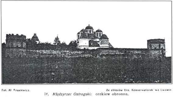 Przyrodzone warunki obronne, położenie między dwiema rzekami o bagnistych brzegach, zwróciły już dawno uwagę na to miejsce, a już w XIV wieku istniał tu zamek, którego data powstania jest nieznana. Wówczas należał Międzyrzecz do ks. Ostrogskich. Zamek tutejszy i stojąca w jego murach cerkiew były kilkakrotnie przebudowywane. Prawa miejskie nadał osadzie w r. 1605 ks. Janusz Ostrogski, który chętnie mieszkał na tutejszym zamku. Na podstawie tranzakcji kolbuszowskiej dobra międzyrzeckie przeszły na Czackich, po rozbiorze Polski w r. 1795 zostały skonfiskowane przez Katarzynę II i oddane gen. Fersenowi, zwycięscy z pod Maciejowic. Ten sprzedał je hr. Ilińskim, ci zaś w połowie XIX wieku, rządowi rosyjskiemu. Już w XIV wieku istniał tu zamek ks. Ostrogskich, który jak wskazują zachowane wały, składał się z przygródka i zamku właściwego. Pierwotnie był on prawdopodobnie drewniany. Murowany zamek gotycki wzniósł w XV wieku ks. Wasyl Ostrogski, zwany Pięknym i jego syn Iwan. Zamek był obwarowany murem i wysokim wałem. Wały te zachowały się od strony Wilji jak również jedna z bram przygródka. Brama ta wystawiona z kamienia i cegły opatrzona jest strzelnicami. Po przygródku pozostał też renesansowy komin murowany, będący jakoby pozostałością kuchni ks. Janusza Ostrogskiego.W r. 1460 kniaź Iwan Ostrogski, syn Wasyla, zbudował wśród murów zamkowych drewnianą cerkiew św. Trójcy, która jednakże spaliła się. W początkach XVI wieku hetman ks. Konstanty Ostrogski wzniósł obronną cerkiew, która przypominała stylowo wznoszoną równocześnie cerkiew zamkową w Ostrogu i również była kombinacją stylu bizantyjskiego i gotyku. Ks. Janusz Ostrogski, kasztelan krakowski jako katolik ofiarował tą cerkiew w r. 1612 na kościół Franciszkanów . Wtedy dobudowano do niej klasztor, przerabiając częściowo urządzenia wewnętrzne. W r. 1866 klasztor Franciszkanów uległ kasacie, dobra klasztoru zabrał rząd rosyjski, kościół zamieniono znowu na prawosławną cerkiew parafjalną, jedno skrzydło klasztoru na plebanję, drugie pozostało puste. W r. 1918 klasztor, użyty na kwatery wojsk niemieckich, uległ częściowemu spustoszeniu, zaś całe archiwum klasztorne całkowitej zagładzie.Cerkiew tutejsza należy do największych osobliwości architektonicznych Wołynia, jako najlepiej zachowana w swoim pierwotnym stylowym charakterze kombinacja stylu gotyckiego i bizantyjskiego, a równocześnie typ kościoła obronnego. Otaczają ją dokoła mury dawnego zamku, mające po rogach potężne baszty, z których jedna zachowała jeszcze polską attykę renesansową i ornamenty sgrafitto, modne w końcu XVI wieku, kiedy zamek i cerkiew przebudowywano za rządów ks. Aleksandra Ostrogskiego. Zewnątrz zwracają uwagę gotyckie okna. Na szczęście pozostały wewnątrz wszystkie dawne barokowe ołtarze po Franciszkanach, z pięknie rzeźbionymi ramami. W ikonostasie umieszczono cudowny obraz M. Boskiej, w srebrnej szacie, zabierarany niegdyś na wyprawy wojenne przez ks. Ostrogskich, koronowany w r. 1779 koronami nadesłanemi przez papieża Benedykta XIV. Obrazy w ołtarzach zastąpiono przeważnie nowszymi obrazami bizantyjskimi, a jeden z nich wyobraża bł. Fiedora Ostrogskiego. Ściany i sklepienie zdobią barokowe stukatury, oraz freski z końca XIX wieku, dobrego pędzla, w manierze Waśniecowa. Są one naśladownictwem fresków cerkwi św. Włodzimierza w Kijowie. W dawnym klasztorze zwracają uwagę piękne sklepienia gotyckie w mieszkaniu plebana. Do cerkwi wchodzi się przez furtkę umieszczoną w lewej baszcie.
