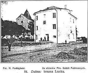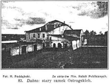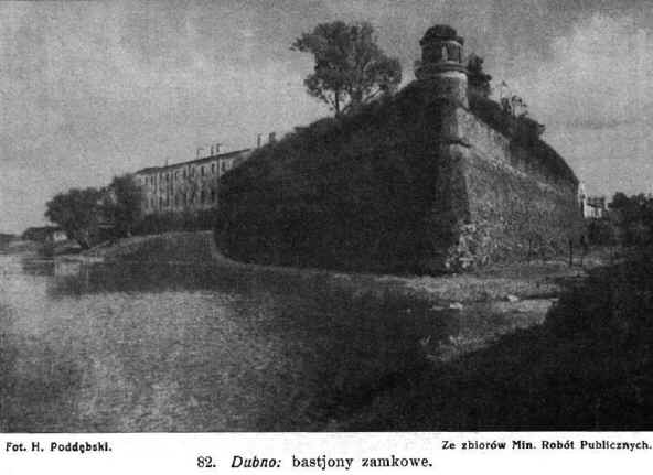 Synagoga z XVI w. uległa częściowemu zniszczeniu w czasie wojny, gdy Austryjacy spalili na niej dach. Obecnie została już odbudowana. W mieście zachowało się kilka staroświeckich dworków np. przy ul. Panieńskiej 23. Zachował się też dworek, w którym umarł Czacki. Pod miastem pobojowisko z r. 1915, ozdobione pamiątkowym obeliskiem austryjackm. Fort "Zahorce" wsławił się w r. 1920 r. bohaterską obroną pod wodzą mjr. Matczyńskiego przeciwko bolszewikom. Na przedmieściu Surmicze rosyjski cmentarz wojskowy na którym pochowano 514 poległych. Niegdyś posiadało Dubno kilka monasterów, w okresie unji Bazyliańskich, poprzednio prawosławnych. Mon. Świętokrzyski obok Karmelitanek z pierwszej połowy XVII w. oraz Spaski na wyspie w południowo-wschodniej stronie miasta, z połowy XV w., obydwa fundowane przez ks. Ostrogskich, stanowiły opactwo dubieńskie, Archimandrytami tutejszymi bywali znakomici ojcowie kościoła wschodniego, jak Smotrycki, Sakowicz, Dubowicz, wyszło stąd wielu biskupów i metropolitów. Fundacji ks. Ostrogskich był też żeński monaster Dubowicki. Dubno leży w szerokiej dolinie Ikwy, 191 m. n. m. Od zachodu ciągnie się 25 km. długie i tyleż szerokie pasmo Gór Pełczańskich, od Szwajcarji Wołyńskiej oddzielone doliną Ikwy. Kilka wzgórz tego pasma wznosi się ponad 300 m. np. zalesiona Czartorja (325 m. n. m.) na południe od Smordwy, szczyt Ostalec (328 m. n. m.) na zachód od Pełczy. Wzgórza sięgają od Dubna i Smordwy, po Kozin i tor kolei do Radziwiłłowa. W środku tych wzgórz bogatych w lasy i kamieniołomy kredy i wapienia leży wioska Pełcza (313 m. n. m.).10 km. na wschód od Dubna obok toru kolejowego leży Mirogoszcz, poza Buderażem i Glińskiem jedna z największych kolonji czeskich na Wołyniu. 17 km. na północ z Dubna leży Młynow, 17 km. na zachód Smardwa, opisano w następnym ustępie. Za Dubnem biegnie pociąg ku południowemu zachodowi doliną Ikwy, mając od zachodu Pełczańskie Góry. W dolinie tej leży następna stacja Kamienica (47 km.) wieś z cerkwią drewnianą, fundacji Jełowickich, stacja węzłowa z koleją lokalną do Krzemieńca (p. niżej). Obok Podłuże, gdzie cerkiew z r. 1845, w r. 1915 spalili Austryjacy. Werba (59 km.) miasteczko o 2.000 m. nad Ikwą którą tworzy tu szeroką bagnistą równinę. Cerkiew drewniana z r. 1774. Okolica w czasie wojny ucierpiała dość znaczne szkody, wyrządzone przez austryjackie wojska, w latach 1915-16. Wtedy uległy zupełnemu zniszczeniu drewniane cerkwie w Minkowcach, z r. 1745, fund. Łysogórskiego, w Beregu z r. 1765, w Turji z r. 1858, a wreszcie stary cmentarz unicki w Onyszkowcach, istniejący od końca XVI w. Jest tu cerkiew drewniana z r. 1881.2 km. na północ z Werby leży miasteczko Ptycza, o 1000 m. przez Zygmunta Starego nadane Ostrogskm. Kościół drewniany z r. 1632 fundacji ks. Władysława Lubomirskiego. Cerkiew drewniana z r. 1864.Za Werbą porzuca tor kolei dolinę Ikwy. Następną stacją jest Rudnia Poczajowska (68 km.).8 km. na północ Kozin, miasteczko o 1600 m., niegdyś własność Kozińskich, później Firleyów, a w XVIII w. hr. Tarnowskich. Na kępie wśród stawu wzniesiono w XVI w. zamek niegdyś Firleyów, później przerobiony na pałac, gdzie w r. 1787 podejmował Jan Tarnowski Stanisława Augusta. Z dawnego zamku pozostały tylko resztki bramy wjazdowej. W pałacu hr. Jana Tarnowskiego, była przed wojną galerja obrazów i biblioteka klasyków starożytnych. Kościół niegdyś Dominikanów, rokokowy, z r. 1776 fundacji hr. Jana Tarnowskiego, po kasacie został w r. 1838 przerobiony na cerkiew, zaś budynki klasztorne zniszczono. Także i cerkiew została w r. 1915 zniszczona przez wojska austryjackie. Synagoga. Kaplica katolicka filialna parafji w Ptyczy. 12 km. na pólnocny-wschód przy drodze do Beresteczka Tesługów, wieś z cerkwią drewnianą i kaplicą katolicką przy dworze.Radziwiłłów (91 km.) ostatnia stacja tej linji na terytorjum Wołynia, do r. 1914 rosyjska stacja graniczna z dużą komorą celną. Hotel Goworowa przy ul. Polowej. Restauracje: w hot. Goworowa, Tyszakowskiego przy ul. Polowej, Ciezierskiego przy ul. Kupieckiej i Kurystyna przy ul. Staropocztowej. Od dworca oddalone jest miasto blisko 2 km. Miasteczko, które zostało założone przez Radziwiłłów z Ołyki, rozwinęło się dopiero po budowie kolei, dzięki ożywionemu handlowi granicznemu. Przed wojną liczyło 10.000 m. Bliskość granicy powodowała rozkwit przemytnictwa. Skutkiem zniszczeń w czasie wojny, oraz odsunięcia granicy po wojnie upadło miasto, które obecnie liczy niespełna 5.000 m.Dwie cerkwie z r. 1856 i 1874. Dobra od Radziwiłłów przeszły na Koniecpolskich (1650), Miączyńskich (1757), potem Gorczyńskich, zaś w koficu XIX w. na Rosjan ks. Urusowych. 5 km. na wschód Krupiec, miasteczko o 600 m. Jest to była własność Wiśniowieckich (1650), Cetnerów, później Lubomrskich, wreszcie rządu rosyjskiego, który przejął tutejsze dobra w r. 1840 za długi Lubomirskich. Dawny kościół empirowy, fundowany w r. 1822 przez głośnego generała Igelströma, byłego ambasadora rosyjskiego w Warszawie, który jest w Krupcu pochowany, został w r. 1866 przerobiony na cerkiew. Na wschód wśród pól stary kurhan. Radziwiłłów jest stacją kolejową dla Beresteczka (30 km.) i Poczajowa (20 km.) opisanych w następnych ustępach.