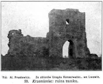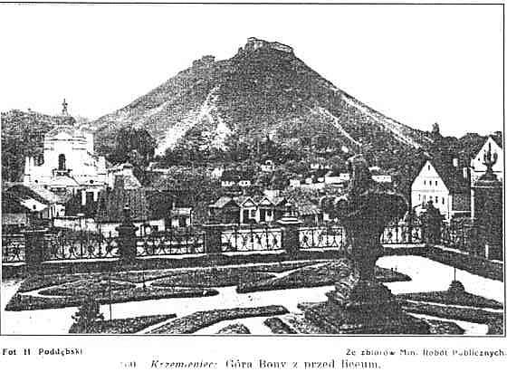 Do dzisiejszych czasów zachowały się tylko resztki murów wewnętrznych, gotycka brama, jedna baszta i fundamenty drugiej baszty. Brama gotycka, którędy prowadził niegdyś główny wjazd do zamku wychodzi obecnie ku przepaści od strony Góry Czerczy, skąd wniosek, że niegdyś albo wiódł ku niej drewniany most zwodzony, co zwiększało obronność zamku, zawieszony nad przepaścią, albo też, że przed bramą był jeszcze kawałek równiny, wystarczający na przeprowadzenie drogi, która później zniknęła przez obsunięcie się góry i brama znalazła się nad przepaścią. Najlepiej zachowała się baszta od strony miasta, na której mury można wyjść sposobem cokolwiek karkołomnym. Łączy się z nią izba wewnątrz murów, utrzymana stosunkowo najlepiej, gdyż przed wojną, podobnie jak na zamku łuckim, była strażnicą pożarną i dlatego mury zostały tu i ówdzie poprawione. Pod nią mieszczą się sklepione piwnice, a podziemny korytarz wychodzi stąd na posiadłość p. Karpińskiej. Mury zamku wzniesione są z miejscowego piaskowca. Z właściwego zamku, który stał wewnątrz murów, oraz z cerkwi św. Mikołaja o której wspominają źrodła historyczne, niema nawet śladu. Z ruin bardzo piękny widok na leżące w dole miasto i okolicę w dalekim promieniu. Szczególnie pięknie przedstawia się stąd dawne liceum i kościół Jezuitów. Jest to najpiękniejszy widok Wołynia, a jeden z najpiękniejszych w Polsce. W dnie pogodne widać na zachodzie Ławrę Poczajowską. Malowniczo przedstawia się Krzemieniec oglądany stąd wieczorem, kiedy na dnie doliny i na zboczach wzgórz zabłysną setki świateł. Grzbietem wzgórz można stąd przejść w 20 minut na sąsiadującą z Górą Bony od północy Górę Czerczę (400 m. n. m.). Odznacza się ona równie pięknym widokiem na miasto jak Góra Zamkowa, a malowniczość tego widoku podnoszą sterczące na pierwszym planie ruiny zamku Bony. U stóp góry stoi katedra prawosławna. Na górze ustawiono krzyż prawosławny poświecony pamięci poległych w wojnie rosyjsko-japońskiej w r. 1905.Dalej na północ wznosi się nad dworcem kolejowym Góra Dziewicza. Spotykamy na niej odkrywki skalne o fantastycznych kształtach, jest tu też niewielka grota. U stóp góry kopalnia kredy. Okolica Krzemieńca jest tak piękna, że nosi nazwę Szwajcarji Wołyńskiej. Otaczające miasto wzgórza, najwyższe na Wołyniu noszą nazwę Gór Krzemienieckich, które są przedłużeniem Woroniaków i uważane za północną krawędź Podola. Najwyższym ich wzniesieniem jest uwieńczone wieżą obserwacyjną wzgórze 407 m. n. m. położone 3 km. na zachód od miasta.Góry te posiadają liczne kamieniołomy wapienia, oraz kredy, a warstwy kredowe tam, gdzie występują w postaci kredy piszącej np. na Kuliczówce i nad cmentarzem żydowskim, są eksploatowane w celach przemysłowych. Na górze Kuliczówce znajdują się też duże pokłady węgla brunatnego, dla eksploatacji którego zbudowano w r. 1897 do kopalni specjalną bocznicę kolejową.Po wojnie jednakże zaniechano eksploatacji węgla. Węgiel brunatny występuje też na południe od miasta w Żołobach , oraz na południowy wschód w Podwysokiem. Niegdyś były też w okolicy Krzemieńca kopalnie rudy żelaznej, a nad Ikwą krzemieni, którym miasto zawdzięcza swą nazwę.Od zachodu wznoszą się nad miastem góry Krzyżowa oraz Wołowica. Wzgórza okolic Krzemieńca porastają lasy mieszane. Przeważnie w partjach dolnych widzimy sosny, brzozy i dęby, w częściach górnych niknie sosna i brzoza, pozostaje dąb, obok którego pojawia się grab i jesion. Lasy zajmują dość znaczne przestrzenie, a na terenie gminy białokrynickiej, obejmującej Krzemieniec dokoła, 40 proc. powierzchni gminy jest zajętej przez lasy. Lasy mieszane występują koło Liszni Małej, Wesołówki i Żołobek, las wyłącznie sosnowy, stosunkowo niewielki (60 ha.) mamy koło Sapanowa. Dla poznania Szwajcarji Wołyńskiej w bliższej okolicy Krzemieńca wskazaną jest przechadzka do wsi Żołoby (4 km. od liceum), położonej od strony południowej, na krawędzi wyżyny wśród jarów i sadów. Dla zwiedzenia dalszych okolic Szwajcarji Wołyńskiej (najpiękniejsze wzgórza ciągną się w kierunku południowo-zachodnim) wskazaną jest przechadzka do Dunajowa i Bereziec (p. niżej).Powiat krzemieniecki liczył w r. 1926 -208.000 ludności mieszkającej na obszarze 3.214 km. 2 (64 mieszk. na 1 km.2) Rusini stanowią trzy czwarte ludności, Polaków jest 28.300 (14%) żydów 14.000. Najwięcej Polaków posiadają gminy szumska (46% ludności), oraz zarudzieńska (24%). W ostatnich latach procent ludności polskiej zwiększył się dzięki osadom wojskowym, a do roku 1926 zamieszkało w powiecie 4.000 osadników. Najwięcej osiadło w gminie wiśniowieckiej (1600 osób). Miejscowa ludność ruska odznacza się wielką gościnnością z jednej, a zabobonnością z drugiej strony. Zachowało się wiele osobliwych zwyczajów, jak np. bicie wychodzących z cerkwi w sobotę przed niedzielą palmową rózgą wierzbową, zachowane od czasów pogańskich obchodzenie niedzieli przewodniej po Wielkanocy, w postaci odbywanej na cmentarzu uroczystości "Prowody", gdzie urządza się uczty na grobach, pozostawiając część jedzenia zmarłym i t.p.Południową część powiatu t. zw. Podole Krzemienieckie, scharakteryzowano w części ogólnej (p. str. 12). Tutaj należy dodać, że z powodu znacznej urodzajności ziemi powiat ma stosunkowo mniej lasów (tylko 23% powierzchni) niż inne powiaty wołyńskie. Najwięcej jest ich w północnych piaszczystych częściach powiatu, najmniej w południowych. Przeważają w powiecie lasy liściaste (9.300 ha.), względnie mieszane (36.300 ha.) podczas gdy lasy szpilkowe (130 ha.) nio lubiące loessu należą do rzadkości. Na obszarze powiatu krzemienieckiego znajduje kres swego zasięgu kilka drzew i tak sosna, która osiąga tutaj kres południowo-wschodn