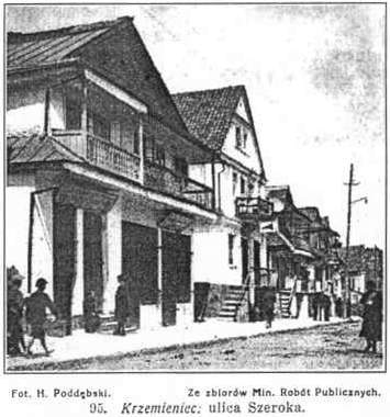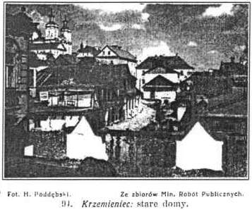 Szczególnie oryginalnie przedstawia się główna arterja miasta ul. Szeroka. Jest ona zabudowana piętrowymi a nawet dwupiętrowymi domami drewnianymi, o oryginalnych facjatach, balkonach, galeryjkach i łamanych dachach. Dziś brudne i zaniedbane, pochylone i walące się, zamieszkałe przez proletarjat żydowski, miały niegdyś swe dobre czasy, gdy w Krzemieńcu w pocz. XIX w. mieszkało nie tylko sporo profesorów i uczniów liceum, ale też kilkadziesiąt rodzin szlacheckich, przebywających tu dla edukacji synów.Wtedy powstały też liczne stojące w ogródkach dworki empirowe zamieszkałe niegdyś przez profesorów liceum. Szczególnie wiele tych dworków stoi w okolicy byłego liceum i ogrodu botanicznego, przy ul. Dyrektorskiej, Pocztowej i Słowackiego. Są ono bądź empirowe z ganeczkiem na piętrze, bądź utrzymane w czystym stylu klasyc znym. Jednym z najstarszych w Krzemieńcu jest dworek Chęcińskiego, przy ul. Pocztowej, o oryginalnej staropolskiej architekturze. Do tego typu domków należały magistrat, szpitale samorządowy i żydowski, szkoły polska i ukraińska i wiele innych. Cechują je klasyczne kolumny i trójkątne frontony, obramowanie okien, kominy na środku dachu, czasem oryginalne portale, jak dom Chęcińskiego.Naogół są one bardzo zgrabne i pełne wdzięku. Do najpiękniejszych należy szkoła ukraińska Dzisiejszy stan tych domów najczęściej wiele pozostawia do życzenia. Zeszpecone bizantyjsko-rosyjskiemi przybudówkami lub parkanami, pomalowane na żótto, często z dziurawemi dachami, pełne wilgoci, smutny przedstawiają widok. Dodatnio wyróżnia się wśród nich gmach Kasy Chorych.Wąskie i kręte uliczki Krzemieńca kryją całe mnóstwo domów drewnianych o szerokich szczytach, zwróconych ku ulicy, i charakterycznych, wystających ganeczkach. Są ono prawdopodobnie resztką podcieni, t. j. krytych chodników. Osobny typ tworzą zajazdy, wobec kołowej komunikacji Krzemieńca z południową częścią powiatu, gdzie nie ma koleji, jeszcze licznie odwiedzane. Nie rzadko w tych zajazdach widzimy rodzaj podcienia, jak np. w hotelu Petrogradzkm. Szerokie dachy tych domków, kryte są staroświecką giętą wypalaną dachówką, t. zw. esówką.Pod względem piękności położenia wybija się Krzemieniec na czoło miast wołyńskich, a w Polsce pod tym względem niewiele ma sobie równych. Leży on w wąskim, a głębokim jarze, esowato wygiętym, wśród wysokich i stromych wzgórz. Dnem jaru płynie niewielki potoczek, a równolegle z nim biegnie wzdłuż szosy z Dubna do Wiśniowca, która przecina całe miasto, główna ulica Krzemieńca, którą jest ul. Szeroka. Na stokach wzgórz rozsiadły się malowniczo dworki, położone wśród dużych sadów, pełnych orzechów włoskich, z których handlu słynie Krzemieniec oddawna. Krzemieniec szczególnie malowniczo przedstawia się oglądany z Góry Bony od ruin zamku.W ogólnym widoku miasta przedewszystkiem rzuca się w oczy duży barokowy gmach dawnego kościoła Jezuitów, obecnego kościoła licealnego, który stoi niedaleko ul. Szerokiej przy ul. Licealnej. Jest to okazały budynek barokowy trzynawowy, z wysoką kopułą na skrzyżowaniu naw i dwiema wieżami od frontu. Został zbudowany w latach 1720-30 kosztem ostatnich książąt Wiśniowieckich, Janusza, Antoniego, oraz Michała Serwacego. Po kasacie Jezuitów stał się kościołem licealnym, a w r. 1832 zamieniono go na cerkiew. Wówczas wnętrze ogołocono z dawnego bogatego urządzenia jezuickiego, a dotychczas pozostaje jeszcze ono dość puste. W r. 1919 został kościół znowu oddany katolikom. Freski jakie niegdyś zdobiły kościół zostały przez Rosjan zabielone, a ich ślady pozostały na suficie bocznego przejścia. Malowniczo przedstawia się absyda kościoła od strony ogrodu. Przed kościołem wznoszą się okazałe tarasy, ozdobione balustradą z pięknemi kamiennemi urnami rokokowemi. Piękny stąd widok na wznoszącą się naprzeciw Górę Bony. Obok kościoła stoi duży gmach dawnego kościoła Jezuitów, który w r. 1740 fundował ks. Michał Serwacy Wiśniowiecki. Po kasacie Jezuitów został gmach w r. 1803 oddany na gimnazjum Czackiego, przyczem po r. 1801 został przebudowany wedle proj. Kubickiego z Warszawy. W r. 1819 gimnazjum to zostało przekształcone na liceum (p. wyżej). Gdy liceum zamknięte w r. 1832, w murach dawnego kolegium jezuickiego umieszczono prawosławne seminarjum duchowne, a później szkołę żeńską.
