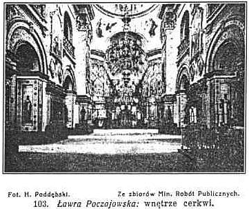 Na zboczach wzgórza stoją liczne kramy odpustowe. Wznosimy się wśród nich ku górze, mijając niewielką kaplicę z kopią obrazu M. B. Peczerskiej. Wejście na dziedziniec zamyka empirowa brama, zwana Świętemi Wrotami, zbudowana w r. 1839, za którą prawosławni zdejmują nakrycie z głowy. Na prawo stoi niewielki budynek mieszczący księgarnię klasztorną (wydawnictwa, opisy, fotografje, pocztówki), zaś na lewo pałac biskupi. Pałac ten od strony dziedzińca dość niepokaźny stoi na zboczu wzgórza, a z przeciwnej strony ma 3 piętra. Wewnątrz dobre portrety fundatotów cerkwi, starościny Hojskiej, Domaszewskich i Mikołaja Potockiego, oraz archimandrytów. Nad całym kompleksem budynków klasztornych i nad całą okolicą dominuje stojąca na szczycie wzgórza soborna Cerkiew Wniebowzięcia (Uśpienia Bogarodzicy). Wybudowaną została ona w latach 1771-91 kosztem Mikołaja Potockiego, według planów Jana Gotfryda Hofmana ze Śląska. Jest to okazały gmach rokokowy z dwiema wieżami od frontu, z kopułą na skrzyżowaniu naw i niewielką wieżyczką nad prezbiterjum. Stylem rokokowym odbija ta cerkiew od wielu innych na Wołyniu, a zbliża się do unickiej katedry św. Jura we Lwowie. Cerkiew ta jest najokazalszą cerkwią kresów wschodnich i najpiękniejszą budowlą kościelną na Wołyniu. Szczególnie pięknie przedstawia się ona z zewnątrz, gdyż zachowała tutaj swój pierwotny wygląd. Natomiast wnętrze ucierpiało znacznie skutkiem usunięcia pierwotnego urządzenia bazyliańskiego, dostosowanego do stylu cerkwi i dodania niezbyt artycznych uzupełnień z XIX w. Założenie cerkwi trzynawowe, krzyżowe. Sklepienie cerkwi zdobią nowoczesne modernistyczne freski, zaś ściany niezbyt artystyczne malowidła z końca XIX wieku przedstawiające cykl cudów M. B. Poczajowskiej. O wiele wyżej pod względem artystycznym stoją pozostałe po Bazylianach dobre obrazy ścienne z końca XVIII w., ze scenami z życia Chrystusa i M. Boskiej. Wielki ołtarz zasłania okazały ikonostas, fundowany w roku 1862 kosztem Aleksandra II, za 50.000 rubli. W jego górnej części umieszczono cudami słynący obraz M. B. Poczajowskiej. Jest to obraz niewielkich rozmiarów, malowany na desce, oprawny w r. 1866 w złotą ramę, wysadzoną drogimi kamieniami i ozdobioną promieniami ze złoconego srebra. Koło obrazu wiszą liczne wota. W czasie niektórych nabożeństw spuszczają obraz przed carskie wrota, a od 1 października do Wielkanocy wynoszą go do cerkwi św. Trójcy. Za ikonostasem znajduje się właściwy wielki ołtarz, w którym umieszczono prestoł, okryty srebną materją wagi 147 kg. Znajduje się tu obraz Zaśnięcia M. B. podarowany w r. 1590 przez Annę Hojską. Nad ikonostasem pomieszczono dwa balkony dla chóru. Na lewo od prezbiterjum znajduje się skarbiec kościelny, biblioteka i archiwum. W skarbcu przedmioty pochodzą z okresu prawosławnego po r. 1831, gdyż poprzednie katolickie zostały usunięte. W nawie głównej niedaleko wejścia, w miejscu gdzie miała się po raz pierwszy objawić Matka Boska, pomieszczono w ołtarzu płaskorzeźbę z brązu z wyobrażeniem tego zjawienia się oraz w relikwiarzu za szkłem kamień z odbiciem stopy M. Boskiej. Znajduje się tu też naczynie z wodą cieszącą się sławą cudowności, palą się zawsze świece a przed ołtarzem klęczą tłumy pobożnych. W lewej nawie w srebrnym relikwiarzu znajdują się relikwie kilkunastu świętych. Nad nawami posiada cerkiew empory, które łączą się z nawami za pośrednictwem oryginalnych eliptycznych otworów, umieszczonych w sklepieniu naw. W emporach tych urządzono po lewej stronie cerkiew św. Aleksandra, po prawej cerkiew św. Mikołaja, na pamiątkę odwiedzin carów Mikołaja I i Aleksandra II. W razie zamknięcia cerkwi należy się zwrócić do odźwiernego w klasztorze lub w księgarni klasztornej. W podziemiach głównej cerkwi znajdują się nadto dwie dalsze cerkwie. Pierwszą kondygnację zajmuje cerkiew Pieczarna, która stanowi jakgdyby długi korytarz pod fasadą cerkwi głównej i tarasu przed tą cerkwią. Okna cerkwi Pieczarskiej są umieszczone w uboczu góry, poniżej głównej cerkwi. Z cerkwi tej skręca się w lewo w połowie jej długości do pieczary, w której pędził pustelnicze życie bł. Hiob, (p. wyżej) i gdzie w srebrnej trumnie fundowanej w r. 1849 przez hr. Annę Orłową spoczywają jego zwłoki. Na prawo od ołtarza z relikwiarzem widzimy wejście do małej pieczary 4 m. szerokiej a 2 m. długiej, w której bł. Hiob zamykał się na modlitwy. Znajdujące się tu duże obrazy Zbawiciela i M. Boskiej w srebrnych sukniach mają pochodzić z pierwotnej cerkwi św. Trójcy z r. 1649. Pod cerkwią Pieczarną znajduje się jeszcze cerkiew św. Antoniego, do której skręca się schodami w lewo, nie dochodząc do poprzedniej cerkwi. W pierwszej sali umieszczono cały szereg zabytków artystycznych (obrazy i rzeźby) pozostałych po Bazylianach. Nabożeństwa w cerkwi św. Antoniego odbywają się tylko w uroczyste święta. Również pod ołtarzem ze Stopką M. Boskiej znajduje się obszerna pieczara, z której ścian kapie woda, pita przez pielgrzymów. Wszystkie te pieczary pierwotnie służyły za mieszkania zakonników. Z tarasu przed główną cerkwią mamy wspaniały widok na daleką okolicę. Nad wzgórzami w stronie południowo-zachodniej jako punkt najwyższy dominuje wzgórze, którego szczyt wieńczy klasztor i kościół Dominikanów w Podkamieniu. (Patrz dr. M. Orłowicza "Przewodnik po Galicji"). Widok ten tak się niegdyś podobał Mikołajowi I, że nazwał okolicę Poczajowa "Rosyjską Szwajcarją". Osobno stoi wysoka dzwonnica, pięknie zaprojektowana, wzniesiona przez Rosjan w miejsce poprzedniej unickiej, w latach 1861-71. Jej złocona kopuła, zdala widoczna, wieńczy cały kompleks zabudowań Poczajowskiej Ławry. Na dzwonnicy umieszczono dzwon z r. 1621, i drugi duży dzwon o wadze 11.200 kg. Ze szczytu dzwonnicy