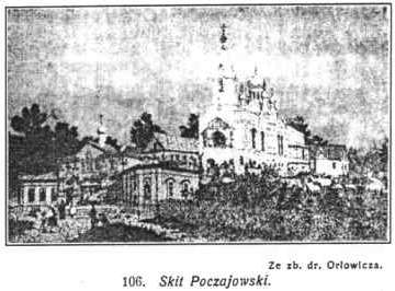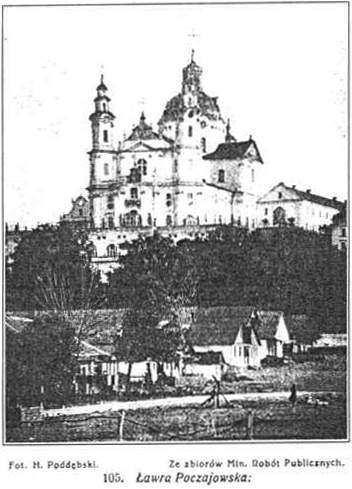 Dzieje klasztoru tutejszego znane są od XIII wieku. Na wzgórzu wśród skał znajdowało się sporo pieczar, podobnych do grot, jakie widzimy dzisiaj na Dziewiczej Górze w Krzemieńcu. W pieczarach tych, częściowo jeszcze zachowanych w podziemnych cerkwiach, wiedli pustelniczy żywot pierwsi zakonnicy prawosławni. Sława miejsca wzrosła, gdy wedle legendy zjawiła się na górze M. Boska, pozostawiając ślad Swej stopy na kamieniu dotychczas zachowanym. Faktyczne dane historyczne sięgają do r. 1597, kiedy to Anna z Kozińskich Hojska, sędzina ziemska łucka, wzniosła murowaną cerkiew Uśpienia Bogarodzicy, gdzie ofiarowała cudami słynący obraz M. Boskiej, darowany jej w r. 1559 przez metropolitę carogrodzkiego Neofita, który wówczas gościł u niej w Urlach. Przełożonym klasztoru był wówczas bł. Hiob (1550-1651), znany zarówno z bogobojnego życia, jak i z wrogiego stosunku do katolicyzmu, dzięki czemu klasztor tutejszy w czasach unji, był jednym z filarów prawosławia. Służyła do tego założona przez bł. Hioba drukarnia, gdzie drukowano liturgiczne dzieła słowiańskie i polskie, skierowane przeciwko unji. Pod koniec życia Hioba w r. 1649 poświęcił on okazałą murowaną cerkiew św. Trójcy, fundowaną przez właścicieli Poczajowa Teodora i Ewę Domaszewskich. Wnosząc z zachowanych ilustracji, był to budynek wzniesiony w stylu bizantyjskim, o charakterze obronnym, z kilku kopułami. Dobudowano do niej kilka mniejszych cerkwi o charakterze kaplic. Cerkiew ta była ufortyfikowana, a wraz z klasztorem otaczały ją wały z drewnianą palisadą i 4 basztami po bokach. W r. 1665 Turcy i Tatarzy pod wodzą Chana Nure dina przez 3 dni oblegali nadarmo Ławrę, a ich odwrót tłumaczy legenda cudownym pojawieniem się M. Boskiej i Hioba.Dopiero w r. 1713 przeszła Ławra w ręce katolickich Bazylianów, a od połowy XVIII wieku klasztor tutejszy był rezydencją generała Bazylianów i prowincjała ich prowincji ruskiej. W r. 1759 wstapił do tutejszego klasztoru słynny starosta kaniowski, Mikołaj Potocki, który żył tu na pokucie do śmierci w r. 1782. Za jego czasów rozebrano dawną cerkiew św. Trójcy, oraz dobudowanych do niej 6 mniejszych cerkwi, a wzniesiono na tym miejscu okazały sobór, wykończony w r. 1785 już po śmierci fundatora. Z jego inicjatywy i za jego staraniem koronowano cudowny obraz M. Boskiej w r. 1779 koronami przysłanemi przez papieża Klemensa XIV, a na uroczystości w dniu 8 września przybyło według zapisków 1000 duchownych obrządku łacińskiego i greckiego, oraz 100.000 wiernych. Uroczystości odbywały się na polu na wschód od Ławry a przypomina je wzniesiona na tym miejscu cerkiew Narodzenia M. Boskiej, oraz wiodąca ku niej od klasztoru aleja lipowa.Ławra Poczajowska za czasów bazyljańskich uchodziła za Częstochowę Unitów, gdzie za dzieciństwa modlił się też często Juljusz Słowacki. W ręku Bazylianów utrzymała się Ławra tylko do powstania w r. 1831, poczem za karę za popieranie powstania zakonników rozesłano do innych klasztorów, a Ławrę oddano duchowieństwu prawosławnemu. Tytuł Ławry otrzymała ona oficjalnie w r. 1833 od Mikołaja I, przyczem uznano ją za czwartą co do znaczenia cerkiew w Rosji, po Ławrze Peczerskiej w Kijowie, ławrach św. Trójcy i Aleksandra Newskiego. Archimandrytami bywali zazwyczaj biskupi wołyńscy. Po odzyskaniu przez prawosławnych Ławrę zaczęto przebudowywać, z glównej cerkwi usunięto urządzenie katolickie, dobudowano Święte Wrota, cerkwie boczne, oraz dzwonnicę. Wszyscy carowie rosyjscy przybywali tu w odwiedziny i ofiarowywali znaczniejsze fundusze na urządzenie Ławry. Klasztor tutejszy mający około 100 zakonników był za rosyjskich czasów siedliskiem agitacji prawosławnej i carosławia, którą to agitację rozciągano też na sąsiednie powiaty w byłej Galicji. Od r. 1881 wydawano jako organ "Poczajowski Listok". Działał tu osławiony z czarnosiecinnej agitacji mnich Witalis, a wydawnictwa Ławry przesiąknięte były nienawiścią do polskości i katolicyzmu. Można się o tem przekonać, czytając przedwojenne wydawnictwa, sprzedawane dotychczas w księgarni klasztornej koło wejścia na dziedziniec. Ławra Poczajowska stanowi kompleks bardzo malowniczo ugrupowanych budynków o kolorowych dachach i złoconych kopułach, które zajmują szczyt wzgórza, 386 m. n. m. dominującego nad miasteczkiem i okolicą. Do budynków tych należy główna cerkiew, dzwonnica, klasztor, kilka cerkwi bocznych i pałac archimandryty.