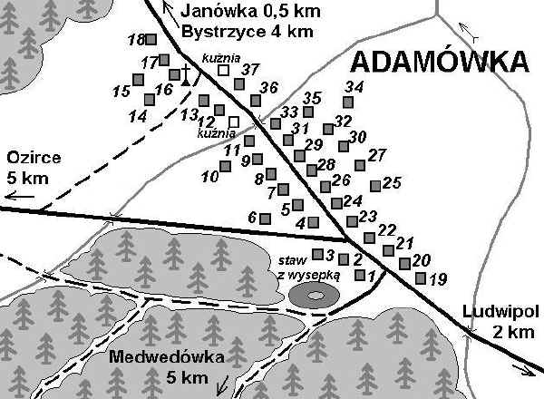 | | ADAMÓWKA, była mieszaną miejscowością, gdzie na 37 zagród (domów) 19 rodzin stanowili Polacy, a 18 Ukraińcy. Do 1939 r. panowała wśród tamtejszych mieszkańców zgoda i wiele rodzin było ze sobą spokrewnionych. Część rodzin, jak np. Filińscy czy Żygadło, pochodziła z polskich rodzin zrusyfikowanych w połowie XIX w. WYKAZ RODZIN (miał być wg gospodarstw, ale jest to chyba nie do ustalenia), stan w 1939r. (najdalej do czerwca 1943 r.) 1. | ŻYGADŁO | Misza - pięcioosobowa rodzina ukraińska. | 2. | SIEROCIŃSKI | Fedor - rodzina ukraińska. | 3. | GALICKI | Michał (zginął za Słuczą jesienią 1943 r.), żona Zofia; córki: Wanda i Halina. | 4. | FELIŃSKI | Stanisław, żona Aniela; dzieci: Tadeusz i Jan. | 5. | FELIŃSKI | Józef, żona Dioniza; dzieci: Leon, Józef, Czesław, Jadwiga, Antonina i Weronika. | 6. | MARCZUK | Józefa, wdowa po Nikiforze; dzieci: Lidia, Helena, Antonina, Walentyna i Aleksander 1923-1943 (zginął od wybuchu granatu w obozie w oddziale ,,Bomby"). | 7. | FELIŃSKI | Michał, żona Adela; synowie: Jan (lat 21 - był w radzieckiej partyzantce) i Antoni (lat 18). | 8. | FILIŃSKI | Mikołaj - rodz. ukraińska. | 9. | FILIŃSKI | Anton - rodz. ukraińska. | 10. | KAWARSKA | Aniela 1912 - c. Józefa i Konstancji z d. Suchodolska. | 11. | KURIATA | Mieczysław, kuśnierz, żona Janina, syn Zygmunt. | 12. | DACZKOWSKI | Roman - s. Mariana i Stanisławy z d. Felińska, kowal (miał kuźnię obok domu), żona (śl.1909) Karolina z d. Galicka, dzieci: Stanisław +1943 (zamordowany przez upa), Halina. | 13. | FELIŃSKI | Stanisław 1901, żona Bronisława 1902 z d. Bronowicka, dzieci: Józefa