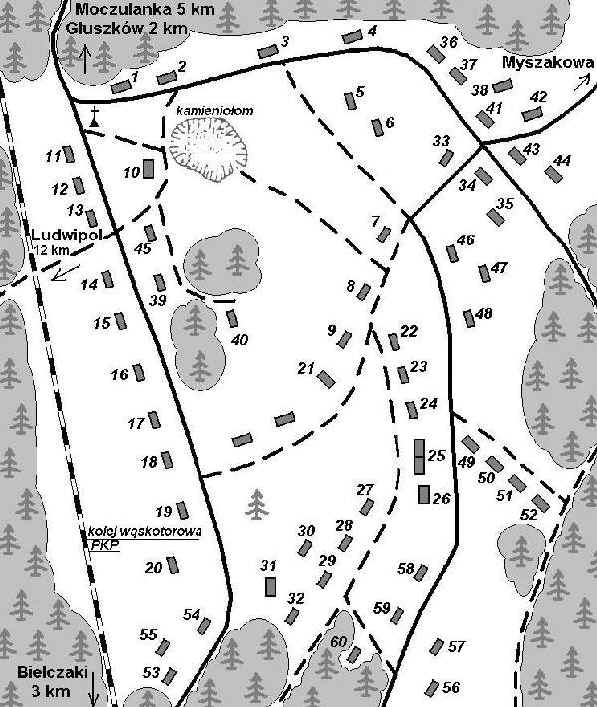 (śl.1894) Konstancja z d. Bronowicka: dzieci: Stanisław, Bronisław, Czesław (poniżej), Janina. | 42. | KOSOWICKI | Czesław - s. Tomasza i Konstancji, żona Teofila; dzieci: Leontyna, Helena, Weronika, Jadwiga, Anastazja, Witold. | 43. | BRONOWICKI | IN., żona IN.; córka IN., synowie: Władysław i Mieczysław. | 44. | BAGIŃSKI | Teofil, żona IN.; synowie: Walenty, Jan, Ludwik i Kazimierz. | 45. | JAWORSKI | Adam, żona Paulina; synowie: Antoni, Bolesław i Leon, córka Zofia. | 46. | JAWORSKI | Dominik, żona Olga z d. Górska; dzieci: Witalis, Stanisław, Jan, Piotr, Józef, Franciszek, Stanisława, Cecylia, Adela i Emilia. | 47. | JAWORSKI | Szymon, żona Ewa z d. Rudek; synowie: Franciszek, Mieczysław, Jan, Hipolit, Cecylia, Teofila i z pierwszej Matki - Kamila, druga żona Ewa Rudek, dzieci: Leontyna, Halina, Bronisława, Aniela, Marysia, Zofia, Władysław, Edward, Stanisław, Józef, | 48. | GĄGAŁA | Teofil, żona Teresa z d. Zalisko, dzieci: Tomasz (poniżej) i inne. | | GĄGAŁA | Tomasz 1920, żona (śl.1943) Domicela z d. Bożyczko - c. Franciszka i Adeli z d. Piaskowska (poz.13) | 49. | GĄGAŁA | Paweł z rodziną. | 50. | ORZECHOWSKI | dzieci Piotra i Anny z d. Szulz (po II mężu Sokalska - w poz. 27), dzieci: Witalis, Marian i Dionizy, Zofia. | 51. | BOŻYCZKO | Piotr 1875, II żona Józefa z d. Pasek (jej I m. Julian Chojnacki - s.Michała i Marianny z d. Wencław, II m. Paweł Bazyliński - s.Jana i Salomei z d. Zwolska), córka Helena 1928. Razem z nimi mieszkała córka Piotra z I małżeństwa - Leontyna z rodziną | | MICHAŁOWSKI | Aleksander +16.11.1943, żona Leontyna 1918 z d. Bożyczko, dzieci: Danuta 1939, Ludwik 1940. Po wojnie na Dolnym Śląsku. | 52. | SĄCZKOWSKI | ? Rafał, I żona IN, II żona Kornelia, dzieci z pierwszego małżeństwa: Mateusz, Janina, Eugeniusz, Petronela | 53. | HORYŃCZUK | IN. - rodzina ukraińska. | 54. | SZTOK | IN. - rodzina ukraińska. | 55. | ONISZCZUK | Kałenyk, żona IN.; synowie: Wasyl i Ołeh. Rodzina ukraińska. | 56. | OLEKSIEJCZUK | Haryton, żona Paraska; dzieci IN. - rodzina ukraińska. | 57. | WŁAS | Hryhor - rodzina ukraińska. | 58. | KURIATA | Wiktor, żona Janina; synowie: Zygmunt, Henryk, Edward i Czesław. | 59. | SOKALSKI | Marceli 1904 - s. Jana i Agnieszki z d. Wąsowicz, żona Bronisława 1904 z d. Kuriata - c. Witalisa, dzieci: Jadwiga 1928, Leontyna 1930, Anna 1933, Janina 1936. Zabrani na Sybir w 10.02.1940 r. Czwórka dzieci zmarła, jedno na Syberii, dwoje w czasie podróży do Kazachstanu, jedno w Kazachstanie. Wróciła Bronisława z Leontyną, Marceli zaciągnął się do wojska. | 60. | GÓRSKI | Władysław, żona Leontyna, synek Stanisław i niemowlę IN. - wszyscy zamordowani 16.11.1943 | 61. | BAKUŁA | Mikołaj z rodziną. | 62. | TUROWSKI | Konstanty, żona i córka IN. - wszyscy zamordowani 16.11.1943 | | Rodziny nieujęte na szkicu: | 63. | KRACZKOWSKI | Telesfor, żona Ewa 1895 (*Myszakowa) z d. Sawicka - c. Konstantego i Dominiki Łykus z Myszakowej, dzieci: Władysław, Tomasz, Janina i Felicja. | 64. | BRONOWICKI | Lucjan - s. Dionizego (i Hieronimy z d. Żygadło?), żona Anastazja z d. Nikorowska lub Nikurowska, dzieci: Feliks 1929, Tadeusz 1933, Zygmunt 1935, Leokadia 1938. Rodzina w czasie pacyfikacji przez Niemców uciekła do Huty Bystrzyckiej i mieszkała jakiś czas u swojej rodziny Jakubowskich u siostry Lucjana. |