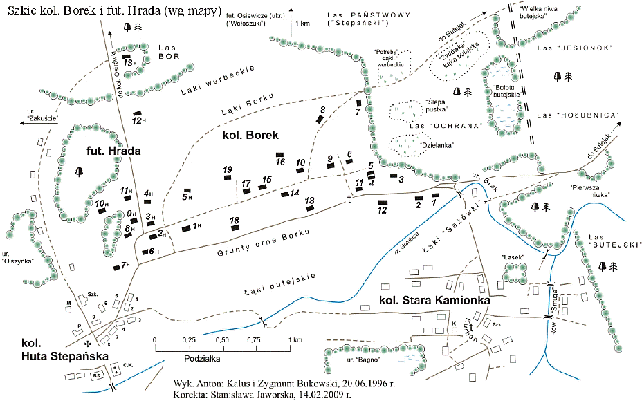 WYKAZ GOSPODARSTW, stan z około 1939 r. Kolonia Borek | 1. | SŁOJEWSKI | Szczepan 1905-1975 - s. Józefa, żona Helena 1907-1995 z d. Sawicka z Krzeszowa, dzieci: Anna 1930, Zdzisław 1932, Ignacy 1940. Wywiezieni do Niemiec, po wojnie w Ostródzie. | 2. | SŁOJEWSKI | Mieczysław 1902-1957 - s. Józefa (i Karoliny Sawickiej?), żona Marcelina z d. Sulikowska z Kamionki Starej - zamordowana przez banderowców 17.07.1943r. - c. Józefa i Józefy z d. Brzozowska, dzieci: Helena 1928-1977 - ciężko ranna w nogi, Edward 13.08.1935-20.09.1964. Od 18.07.1943 Mieczysław z synem Edziem ukrywał się w lesie k. Butejek. Następnie ukrywał ich Ukrainiec Petro Ilkowycz Bazyluk. Po wkroczeniu A.Czerwonej przenieśli się do Stepania. W 1945 osiedlili się we wsi Rataje k.Wołowa. | 3. | KALUS | Teofil 1892-1951 - s. Antoniego i Marianny z d. Ziółkowska, żona (śl.1914) Weronika 1896-1969 z d. Słojewska z Borku, dzieci: Edward 1919-7/8.02.1943 zamordowany w Butejkach, Janina 1929, Stanisława 1931. | 4. | ANDRZEJEWSKI | Jerzy 1911-1970 - s. Józefa i Apolonii z d. Skrzybalska, żona Franciszka 1915-1991 z d. Gutkowska z Siedliska, dzieci: Julianna 1936, Genowefa 1940, Edward 1941, Feliks 1943, po wojnie w Łebie. | 5. | ANDRZEJEWSKI | Mieczysław 1.01.1901-1940 (st.posterunkowy PP, pojmany w Stepaniu, wywieziony i zamordowany przez NKWD, pogrzebany w Miednoje) - s. Józefa i Apolonii, żona Bronisława ~1900 z Lednego, dzieci Jan 1927, Jadwiga 1929, Piotr 1931, Celina 1935. | 6. | SAWICKA | Anna "ciocia Hania" ~1873-16/17.07.1943, wdowa po Andrzeju. Mieszkał z nią syn Antoni z rodziną | | SAWICKI | Antoni - s. Andrzeja i Anny, żona Zofia z d. Domalewska, córeczka Danusia. Po wojnie koło Pabianic. | 7. | SAWICKI | Leonard ~1899 - s. Andrzeja i Anny, przez pewien czas sołtys w Borku, żona Rozalia ~1906 z d. Sulikowska z Debrycy - c. Stanisława, zamordowana przez banderowców w bestialski sposób w połowie marca 1943 r. w Rudni, zgwałcona, z odciętymi piersiami, z rozprutym do brzucha kroczem, wydłubanymi oczyma, skrępowana drutem kolczastym. Po kilku dniach ciało odnaleziono w rzece Mielnica pod lodem, dzieci: Czesław 1930 (w Anglii), Irena 1933 (w Łodzi). | 8. | KUNICKA | Helena 1895-1959 z d. Gutkowska z Siedliska, wdowa po Władysławie 1883-1937, dzieci: Stanisław 1918-1997, Irena 1920-1978 (poniżej), Leonarda 1927, Franciszek 1932, Edward 1937. | | KAŁUŻNY | Stanisław z Kamionki Nowej, żona Irena z d. Kunicka, syn Mirosław. Po wojnie na Dln. Śląsku | 9. | SAWICKI | Cyprian 1894-1954, żona Anna ~1899 z d. Sawicka (a wg ksiąg par. pasowałoby: z d. Domalewska, śl.1918), dzieci: Marian 1920-03.1943 (zamordowany w Rudni), Wacław l. ok. 21, Janina l. ok. 18 | 10. | SZABELSKA | Albertyna 1885-1958 z d. Sawicka, wdowa po Piotrze Domalewskim, ich dzieci: Tadeusz 1907-1987, Stanisław 1912-1963, Zofia l ok. 26, córka z Piotrem Szabelskim Witolda (Tola) 1923 | 11. | SKRZYBALSKI | Józef ~1906 - s. Franciszka i Józefy, żona Maria ~1909 z d. Sawicka - c. Andrzeja i Anny, dzieci: Anna 1931, Romuald 1936, Halina l. ok. 6 | 12. | SKRZYBALSKA | Józefa, 1873-17.07.1943, z d. Zawadzka, wdowa po Franciszku 1855-1922 - s. Stanisława i Marcjanny z d. Kowalewska, dzieci: m.in. Konstanty (w latach 1928-40 był kierownikiem poczty w Hucie Stepańskiej), Antoni (poniżej), córka IN (po m. Libner, ich dzieci poniżej). Franciszek miał brata Jana. | 12. | SKRZYBALSKI | Antoni 1909-1990, żona Genowefa ~1920-1943 z d. Sawicka - c. Alojzego z Hrady, dzieci: Ludwik 2.01.1943-16.07.1943 . Genowefa zginęła wraz z synem w schronie Felicjana Sawickiego w Hradzie 16.07.1943. | | LIBNER | - dzieci IN. i IN. z d. Sawicka - c. Franciszka i Józefy, dzieci: Teresa 1935-17.07.1943, Edward 1936-16.07.1943 (zamordowane z babcią Józefą). | 13. | SŁOJEWSKI | Jan ~1913 z Tuczyna, żona Stanisława 1921-1995 z d. Skrzybalska - c. Franciszka i Józefy, dzieci: Konstanty 1936, Edward 1937, Mirka | 14. | SAWICKA | Paulina, l. ok. 50, druga żona Hipolita (rozwiedziona z Hipolitem), syn Władysław | 15. | KALUS | Antoni 1917-1999 - s. Teofila i Weroniki (w poz. 3.), żona Maria 1921-1980, z d. Janicka z Borku, dzieci: Danuta 1938, Romuald 1939. | 16. | ANDRYSIAK | Antoni 1901-1954 - s. Stanisława i Antoniny z d. Tomasik z Siedliska, żona Olga 1901-1989 z d. Kałużna ze Stepania, dzieci: Józef 1919, Stanisława (m.Płachciński), Adam 1925-1994, Zofia 1928 (Sawońska), Mirosław 1938-2008. Po wojnie: Królikowo k/Olsztynka. | 17. | DROZDOWSKI | Adam 1888-1954, żona Wanda 1899-1961 z d. Sawicka - c. Anny i Andrzeja, dzieci: Anna 1921-1984, mąż Momot, mieli 3 synów | 18. | SAWICKA | Mieczysława ~1898 - c. Marcina i Anieli z d. Felińska, panna. Mieszkał z nią jej brat Stanisław. | | SAWICKI | Stanisław 1918 - s. Marcina i Anieli z d. Felińska, żona Stanisława 1922 z d. Sawicka, mieli 2 synów. Stanisław został wywieziony na roboty do Niemiec. Po II WŚ zamieszkali na Dolnym Śląsku. | 19. | HOROSZKIEWICZ | Jan - s. Ludwika i Ewy z d. Seredzińska, żona (śl.1902) Łucja z d. Kaszuba, dzieci: Feliks,