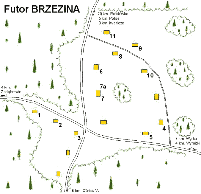 Futor (bardziej kolonia) Brzezina powstawała w latach 1920-1930 roku, na terenach państwowych (rozparcelowane majątki ziemskie), na północ od futoru Osy-Bród, wykupionych od Państwa przez nowych osadników, rodziny Kobylańskich, Sochów itd. Wg opracowania Cz. Piotrowskiego, w ostatnim okresie jej bytności, Brzezina liczyła 13-15 zagród. PLAN PAMIĘCIOWY |  | Opracował Ryszard B Kobylański z danych przekazanych przez płk. Mieczysława Zakrzewskiego b. mieszkańca Zadąbrowia oraz Genowefy Cedro - Kobylańskiej b. mieszkanki Brzeziny |