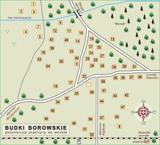dzieci: Jan i Rozalia 1929 (zamordowane siekierami przez Ukraińców 6/7.12.1943 r. | 7. | JANUSZKIEWICZ | Hieronim „Harończyk”, żona Genowefa, córki: Jadwiga, Czesława, Halina. | 8. | KOREŃCZUK | Adam „Czaban” (Ukrainiec), żona Ewa, syn Włodimir, po wojnie pozostał na miejscu (w Netrebie - byłe Budki Borowskie). | 9. | ZALEWSKI | Franciszek, żona Wiktoria, syn Kazimierz, córka Kazimiera, córka Stefania. | 10. | KOREŃCZUK | Mikołaj, żona Michalina, syn Mieczysław, syn Józef (2 l.) i córka (IN., 6 m-cy) - w nocy z 6 na 7.12.1943 zostali zamordowani, zaś Michalina ciężko ranna została uratowana przez lekarza z radzieckiego oddziału partyzanckiego. Ocaleni wyjechali i osiedlili się w Dunino koło Legnicy. | 11. | ŻUR | Jan, matka Wiktoria, żona Stanisława, dzieci: Leon 1929-2008 (Budki B.-Giżycko), Marian, Teresa +07.1943 - ciężko ranna przez Niemców z karnej ekspedycji, zmarła. Po wojnie w Jedwabnie i Giżycku. | 12. | ZALEWSKI | Jakub (następny po Rafale Zalewskim sołtys) - s. IN i Rozalii (w poz. 45), żona Felicja, córka Franciszka, syn Roman. | 13. | KRYŻOW | Bazyli (Rosjanin), żona IN., Ukrainka, syn IN.. Brak więcej danych. | 14. | ZALEWSKI | Rafał, sołtys, żona Wiktoria, córka Stanisława, syn Antoni. Po wojnie w Sławnikowicach koło Zgorzelca. | 15. | ZALEWSKI | Józef 1886? - s. Wincentego i Albertyny Cytryckiej z d. Fuks, żona Marta z d. Szeremeta - c. Charytona i Petroneli, dzieci: Jadwiga 1926, Antoni 1930, Walenty 1932, Marian 1934. W 1945 osiedlili się we wsi Stobno gmina Złocieniec pow. Drawsko Pomorskie. Od 6.04.1950 roku mieszkali we wsi Morzęcin, gmina Żmigród, pow. Milicz. | 16. | KOSTIUK | Andrej (Ukrainiec) +1947, żona IN., synowie: Stanisław, Petro i IN. Obecnie (2001 r.) zamieszkują w Borowem i Netrebie. Andrej został okrutnie zamordowany (przybity drewnianym kołkiem przez brzuch do dziupli w leżącej kłodzie drzewa) przez UPA w 1947 roku w lesie, na uroczysku „Niebaba”. | 17. | KOZIŃSKI | Łukasz z rodziną. Wyjechali do nowej Polski. Łukasz zmarł w drodze, pochowany 9.05.1945 w Chełmie Lubelskim. | 18. | | Rodzina ukraińska (INN.). Poza lokalizacją brak innych danych o tej rodzinie i jej losach. | 19. | JANUSZKIEWICZ | Hieronim - s. Jana i Anny z d. Wyszyńska, żona Teofila z d. Pawłowska, dzieci: Kazimierz, Jan, Józef, Władysław 1926 (w dokumentach ur.30.04.1928r.), Leontyna, Jadwiga, Ewa, Aleksander (Olek - partyzant radzieckiego oddziału im. Czapajewa, później żołnierz WP, poległ pod Berlinem). Po wojnie: Jedwabno k. Szczytna i okolice Szczytnej Śl. w Wałbrzyskiem. | 20. | | Rodzina polska (INN.). Nazwisko niezapamiętane. | 21. | SKOBELSKI | Feliks, żona Teofila, dzieci: Maria, Jadwiga, Franciszek, Tadeusz, Eugeniusz. Po wojnie w Żarach. | 22. | SKOBELSKI | Bartłomiej, żona Katarzyna, dzieci: Franciszek, Dionizy 1926-19.09.1944 (żołnierz WP., poległ w czasie forsowania Wisły idąc z pomocą Powstaniu Warszawskiemu), Walenty (walczył pod Monte Cassino), Marian. Po wojnie w okolicy Żar w Lubuskiem. | 23. | SKOBELSKI | Witalis, żona Paulina, synowie: