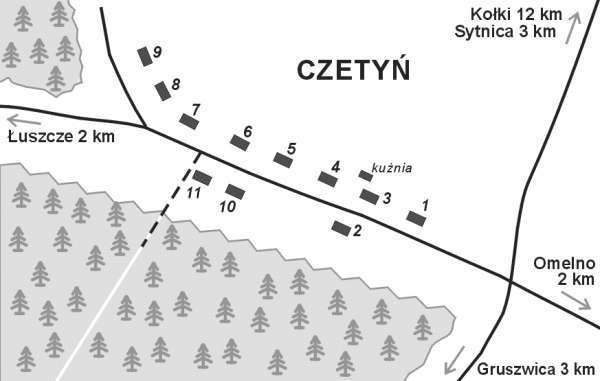 Kolonia Czetyń należała do gromady (sołectwa) Gruszwica i była zamieszkana przez Polaków. W 10 zagrodach mieszkało w 1943 roku 11 rodzin - 46 osób.| WYKAZ GOSPODARSTW, stan w około 1939 r. (najdalej do marca 1943 r.) | 1. | MYSZKA | Jan, żona i 2 dzieci; | 2. | SUCHODOLSKI | Kacper, żona Michalina z d. Słodkowska, syn Leszek. Mieszkał tu też brat Kacpra - Władysław. | | SUCHODOLSKI | Władysław, żona (IN.), dzieci: Bolesław i Teresa. | 3. | KOWNACKI | Paweł (Piotr?), żona Adela, dzieci: Jarosław, Zofia; | 4. | SŁODKOWSKI | Emeryk - s. Władysława (s. Jana i Zofii 1875-16.08.1923 z d. Rosińska) i Franciszki 1878 z d. Słodkowska, żona Franciszka z d. Koksanowicz, dzieci: Bolesława Dyoniza 1929 (m.Władysław Słodkowski z Nowej Ziemi), Krzysztofa 1930 (po m.Wróblewska), Daniela 1938 (po m.Wojtak). Mieszkała tu jeszcze matka Emeryka (zajmowała się zielarstwem). W czasie opisanego poniżej napadu, Emerykowi Ukraińcy złamali prawą rękę, przez co do końca życia pozostał inwalidą. Emeryk miał jedną siostrę Brygidę. | 5. | nn (GIZA?) | - małżeństwo w starszym wieku, bezdzietne. | 6. | KIJ | Roman 1914 - s. Jakuba i Katarzyny, żona (śl.1938) Joanna 1916 z d. Słodkowska - c. Jana i Franciszki, dzieci: Ignacy, Alfreda, Edward [...]. | 7. | BEDNARSKI | - rodzina, 6 osób, w tym 3 dzieci i brat gospodarza - kawaler. | 8. | STAWIERAJ | Józef, żona Waleria z d. Malinowska, syn Leon z żoną Wiktorią (z d. Łozowicką pochodzącą z Jamskiego) i córką Alicją; (popr. M.S.) | 9. | BOJKOWSKI | Józef, żona Teofila +1943, dzieci: Weronika 1912, Franciszek 1916, Helena 1918, Jan 1921. Bestialsko zamordowana została matka - Teofila (Józef przeżył). Weronika ranna w bark (do końca życia nie odzyskała sprawności prawej ręki, a właściwie ramienia). Rodzina przesiedlona do wsi Pielgrzymowice k/Namysłowa, Franciszek ostatecznie zamieszkał pod Częstochową. | 10. | BEDNARSKI | rodzina 5 osób w tym 3 dzieci; | 11. | SZPRYNGIEL | Kazimierz +1943 - s. Antoniego z Rudni, sołtys, żona Michalina, dzieci: Zygmunt, Roman i dwoje bliźniąt (IN.). Rodzina mieszkała za gospodarstwem Stawierajów (10). W dniu napadu Ukraińców, Kazimierz został bestialsko zamordowany od uderzenia orczykiem od wozu w tył głowy i przebity bagnetem. Żonę pobito. V.n.: Szpryngel. | | Brak więcej informacji. Proszę Państwa o pomoc w uzupełnianiu wykazu. |