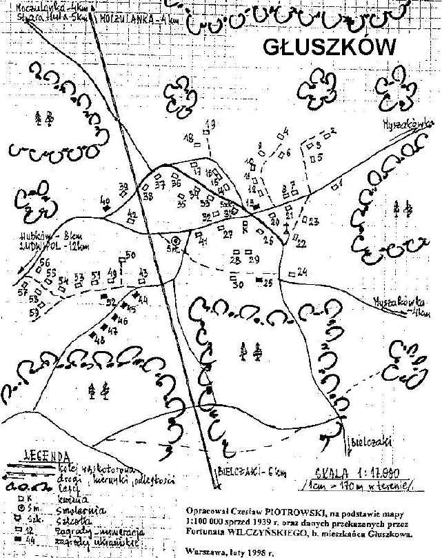 WYKAZ GOSPODARSTW, stan w około 1939 r. (liczba gospodarstw pod koniec 1937 r. wynosiła 46). 1. | SŁAWIŃSKI | Marian, żona Małgorzata z d. Wilczyńska - c. Karoliny z d. Turowska, dzieci: Aniela (mąż Jurkowski), Zofia (mąż Kazimierz Gacek). | 2. | MATYJASZCZUK | Marceli, żona Genowefa 1914 - c. Jana, dzieci Zygmunt 1935 i Edward 1937. Do 1939 r. Marceli był komendantem ,,Strzelców" w Głuszkowie. Cała rodzina została wywieziona w końcu czerwca 1940 r. na Syberię, gdzie Marceli zginął. W domu tym w 1943 r. mieszkali uciekinierzy z okolicznych zagrożonych polskich osiedli. | 3. | WILCZYŃSKI | Franciszek - s. Antoniego, żona Karolina, córka Helena. | 4. | LISOWSKI | Jan - s. Feliksa i Anieli z d. Wierzbicka (Werbicka?), żona (śl.1904) Karolina z d. Łabęska, dzieci: Hipolit, Zygmunt, Genowefa, Anna. | 5. | WILCZYŃSKI | Antoni - s. Fortunata (s.Michała i Elżbiety z d. Rudnicka) i Anieli z d. Zabłocka (to druga żona Fortunata, pierwszą była Paulina Bagińska), żona (śl.1900) Józefa z d. Falkowska, dzieci: Konstanty i Cecylia. | 6. | WILCZYŃSKI | Fortunat (Władysław?) - s. Antoniego, żona Bronisława z d. Turowska, córka Petronela (m.Władysław Łoś), syn Jan. Po wysiedleniu zam. w Wilkowie Wielkim pow. dzierżoniowski. | 7. | LISOWSKI | Franciszek - s. Feliksa i Anieli z d. Wierzbicka, żona (śl.1910) Teofila z d. Bagińska, 3 dzieci IN. | 8. | LISOWSKI | Józef - s. Feliksa i Anieli z d. Wierzbicka, żona (śl.1906) Adela z d. Wysocka, 3 dzieci IN. | 9. | FASOWICZ | Antoni 1911, żona Wincentyna 1915 z d. Wilczyńska - c. Piotra i Petroneli, dzieci: Helena i Aniela (Buczna). Antoni walczył w I Dywizji im.Tadeusza Kościuszki, zginął w sierpniu w 1944r. przy forsowaniu Wisły. Po wojnie w Jaźwinie na Dolnym Śląsku. | 10. | WILCZYŃŚKI | Piotr 1895 - s. Fortunata i Anieli z d. Zabłocka, żona Petronela 1897 z d. Czekalska, dzieci: Wincentyna (Fasowicz, w poz. 9), Antoni (poniżej), Fortunat - aktywny działacz samoobrony i członek oddziału partyzanckiego, ciężko ranny 4.09.1943 r. w boju z banderowcami pod Wilią. Po wojnie rodzina zamieszkała na Dolnym Śląsku. | | WILCZYŃŚKI | Antoni 1916, żona Władysława z d. Poliwka (Czeszka), 1-miesięczny synek Jan. Wywiezieni 10.02.1940 r. z Tajkur na Syberię jako rodzina osadników, Antoni potem był w armii gen. Andersa, po wojnie w USA. | 11. | CZEKALSKI | Jan, żona Helena i córka Zofia 1930. | 12. | WILCZYŃSKI | Franciszek - s. Fortunata, żona Karolina i syn Antoni z żoną Leokadią - z d. Suchodolska. | 13. | DEMCZUK | Ilja (Hilko), żona Marianna (Maryna) z d. Chamin, 3 dzieci w tym córka Nadzieja 1922 (Wasilewska, w poz. 35). Rodzina ukraińska. Demczuk (Ilja, czy syn?) walczył w armii Andersa, po wojnie w Olesznie. | 14. | SZAPIRO | Chaim, żona i 4 dzieci IN. Chaim był kowalem i właścicielem kuźni. Zamordowani w 1942 r. w getcie w Ludwipolu. Od 1943 r. w domu tym mieszkali uciekinierzy ze zniszczonych przez Ukraińców polskich osiedli. | 15. | RYFKA i CHIRYK | - zamordowani w 1942 r. w getcie w Ludwipolu. Od 1943 r. w domu tym mieszkali uciekinierzy ze zniszczonych polskich osiedli. | 16. | TUROWSKA | Antonina (wdowa) i 2 dzieci IN. Dom Antoniny przylegał bliźniaczo do domu poz.15. | 17. | STACHURSKI | - dzieci Antoniego (w poz.56) i Marianny +1937 z d. Wilczyńska: Franciszek, Wincenty +1933 (zginął tragicznie), Kazimierz 1902-1988, Jan 1923, Bronisława, Józefa, Aniela - najmłodsza, zginęła jako niemowlę w pożarze domu. Po wojnie zamieszkali z rodzinami na terenie Dolnego Śląska. | | STACHURSKI | Jan 1923 - s. Antoniego i Marianny z d. Wilczyńska, żona Anna 1917, syn Franciszek 1943. | 18. | NOWAKOWSKI | Wojciech, żona Cecylia z d. Wilczyńska, syn Franciszek. | 19. | JEWGIEJUK | z żoną i 6 dzieci (IN.). | 20. | KROSS | Josio, żona Ryfka, 4 dzieci IN. - wszyscy zamordowani w 1942 r. w getcie w Ludwipolu poza 2 synami Szyja i Lejba, którzy się uratowali. Od 1943 r. w domu tym mieszkali uciekinierzy ze zniszczonych polskich osiedli. | 21. | WILCZYŃSKI | Piotr - s. Jana, żona Maria; córki: Franciszka i Janina. | 22. | WILCZYŃSKI | Fortunat 1888 - s. Jakuba i Rozalii z d. Marcinkowska, żona Tekla z d. Bronowicka, dzieci: Wanda 1937; Edward, Helena, Maria, Jan i Irena-zabici niewypałem-miną, Kazimiera. W domu tym mieszkali również: | | BAGIŃSKI | Marian, żona Filomena, dzieci: Zofia, Kazimierz i Zbigniew. | 23. | WILCZYŃSKI | Franciszek 1883- s. Jana i Anieli z d. Lech, żona (śl.1909) Maria 1879 z d. Wilczyńska oraz syn i córka z rodzinami: | . | WILCZYŃSKI | Wincenty - s. Franciszka i Marii, żona Józefa, 2 małych dzieci: Zofia, Zygmunt. | . | SZCZEPANIAK | Feliks, nauczyciel w Głuszkowie, żona Bronisława - c. Franciszka i Marii, dzieci: Helena 1933 i Jerzy. Bronisława z dziećmi została wywieziona w końcu czerwca 1940 r. na Syberię. Feliks, p.por. rez. ps. ,,Słucki" ukrywał się w rejonie Głuszkowa do lipca 1941 r., a potem włączył się w organizację samoobrony. W sierpniu 1943 r. został d-cą kompanii w oddziale AK ,,Bomby" na Zasłuczu i był na tym stanowisku do 25.07.1944 r. w 27 Woł. DP AK. Rodzina osiedliła się po wojnie w rejonie Kłodzka. | 24. | SIEDLECKI | Piotr, żona Maria, 5 dzieci IN. | 25. | ŁOZOWICKI | Piotr, żona Ewa, 4 dzieci IN. Rodzina ukraińska. | 26. | WILCZYŃSKI | Kazimierz 1884 - s. Jana i Anieli z d. Lech, do 1939 r. był gajowym i sołtysem w Głuszkowie, żona (śl.1907) Adela 1888 z d. Wasilewska - c. Piotra; synowie: Mieczysław 1918 i Zygmunt 1926. Cała rodzina została wywieziona 10.02.1940 r. na Sybir. W domu tym mieściła się potem "Selrada", a od 1943 r. była tu placówka samoobrony i placówka oddziału AK ,,Bomby-Wujka". | 27. | WILCZYŃSKI | Piotr - s. Kazimierza, żona Helena, córki: Janina i
