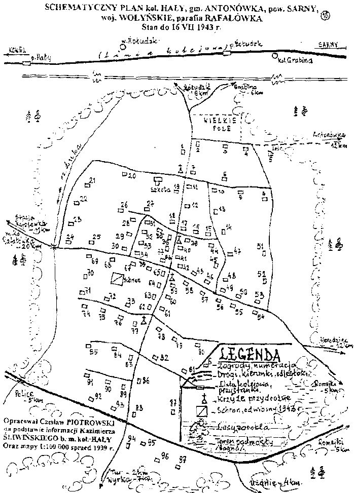 WYKAZ GOSPODARSTW, stan z około 1939 r. 1. | MILEWICZ | Franciszek, żona Janina z d. Śliwińska. | 2. | CZARNECKI | Stanisław, żona Antonina z d. Żarczyńska, córki: Helena, Genowefa 1928 i Teresa 1941. | 3. | MILEWICZ | Gracjan, żona Leontyna z d. Żarczyńska, mieli kilku synów, m.in. Stanisław 1910 (poniżej), Władysław, Franciszek i Marek. Zostali wywiezieni na przymusowe roboty do Niemiec. Po wojnie osiedlili się we Wschowie (Władysław w Australii). | | MILEWICZ | Stanisław, żona Kazimiera z d. Śliwińska, dzieci: Jan 1940. | 4. | ŚLIWIŃSKI | Marian 1900, żona Aniela 1903 z d. Walentynowicz, syn Dionizy. | 5. | MISZKIEWICZ | Cezary (potem Mickiewicz) 1898, wojskowy - s. Antoniego (s.Piotra z 1-go małżeństwa) i Malwiny 1878, zastrzelonej przez Ukraińców 15.07.1943 r., żona Elżbieta 1904 z d. Miszkiewicz - c. Franciszka i Antoniny z Wyrobek, dzieci: Mieczysław 1924, Genowefa 1928, Czesław 1935. W dniu 18.07.1943r zostali wywiezieni na roboty do Niemiec razem z przebywającym tu ojcem Elżbiety, po wojnie w 1945 r osiedlili się w powiecie Góra na Dolnym Śląsku. Rodzeństwo Cezarego to: Stanisław i Adam (wywieziony z żoną w głąb Rosji). | 6. | BIRUTA | Bronisław, żona IN z d. Kotecka, dzieci: Józef, Jan, Janina 1922. Józef był zesłany na Sybir, wstąpił na ochotnika do wojska i przeszedł cały front. Po wojnie Jan i matka mieszkali do śmierci we Wschowie. | | BRZOZOWSKI | Marcin 1906 - s. Juliana i Albiny z Wydymera, nauczyciel, żona (śl.1938) Janina 1922 z d. Biruta - c. Bronisława i I.N z d. Kotecka. Marcin zesłany na Sybir, powrócił pod koniec lat 50-tych i krotko po tym zmarł, pochowany w Gdańsku Janina zamieszkała w Sopocie. | 7. | BIRUTA | Stanisław 1883 - s. Piotra (s. Cypriana i Tekli z d. Janicka) i Pauliny z d. Libera, żona Regina 1889 z d. Kołodyńska, dzieci: Stanisława 1907 (m. Antoni Wawrzynowicz - razem w Wyrce), Anastazja 1928 (z siostrą w Wyrce). Po wojnie osiedlili się koło Złotowa. | 8. | BIRUTA | Adam - s. Cypriana i Tekli z d. Janicka, żona (śl.1896) Marianna z d. Myszakowska. Brat Adama - Hieronim (ż.Marianna Kopiej) prawdopodobnie też mieszkał w Hałach. | 9. | BIRUTA | Mikołaj z rodziną | 10. | ŚLIWIŃSKI | Józef 14.09.1909 - s. Antoniego i Anieli 1888 z d. Przybysz, żona Rozalia 6.08.1910, dzieci:
