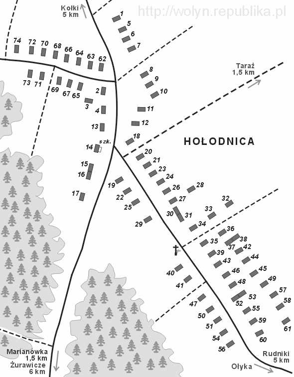 Kolonia HOŁODNICA powstała na przełomie XIX i XX wieku w wyniku parcelacji majątków ziemskich i dzierżawy ziemi gospodarczej do I wojny światowe. Jej założycielami były rodziny przybyłe w większości z Polski Centralnej (Kongresówki). Według spisu ludności z 1921 r. kolonia Hołodnica liczyła 49 zagród zamieszkanych przez 251 osób, wg mapy sztabowej w 1936 r. było już 90 zagród. Obok kolonii Taraż było to jedno z największych osiedli polskich w gminie Kołki powiatu łuckiego.| WYKAZ GOSPODARSTW, stan w około 1939 (najdalej do 10 kwietna 1943 r.) | 1. | SKIREWSKI | Józef z rodziną - 5 osób. | 2. | SKIREWSKI | Antoni z rodziną - 6 osób. | 3. | PRZYBYSZ | Jan z rodziną - 5 osób. Wariant nazwiska: Przybyszewski. | 4. | PRZYBYSZ | Antoni z rodziną - 4 osoby. | 5. | ROSIŃSKI | Zygmunt - s. Wojciecha 1860-1938 (s.Floriana i Józefy z d. Bednarska) i Leokadii z d. Sawicka, żona, 3 dzieci. Rodzeństwo Zygmunta to: Antoni (poniżej), Cyryl (poniżej), Franciszek, Józef, Jadwiga i Monika.. | 6. | ROSIŃSKI | Antoni - s. Wojciecha i Leokadii, żona, 2 dzieci. | 7. | ROSIŃSKI | Cyryl - s. Wojciecha i Leokadii, wdowiec po Monice 1896-1931 z d. Słowikowska, dzieci: Dionizy, Jan, Wacław i Genowefa | 8. | KRUPIŃSKI | Zygmunt 1894-19.02.1941 - s. Wincentego i Teofili 1872-1932 z d. Kownacka (c.Mikołaja), żona Antonina z d. Zaręba, córki: Wacława Joanna i Marianna. | 9. | ZAREMBA | Antonina, wdowa, 2 dzieci. | 10. | ZAREMBA | Łucjan - samotny. | 11. | ZAREMBA | Jan, żona Marianna (z d. Gilewska z Marianówki?), dzieci: Czesław, Ludwika. Po wojnie przesiedleni do Malborka. | 12. | ZAREMBA | Władysław z rodziną - 5 osób. | 13. | ROSIŃSKI | Franciszek, żona Władysława z d. Słowikowska, dzieci: Leon, Stanisław, Władysław, Bolesław, Henryk, Jadwiga i Helena. Po wojnie: Możdżanowa, gm. Ustka. | 14. | - | SZKOŁA podstawowa. | 15. | ROSIŃSKI | Jan - s. Piotra +1931 (zm. jako wdowiec) i Kazimiery z d. Słowikowska, żona, dziecko. Rodzeństwo Jana to: Antoni, Zygmunt, Emil, Regina, Eufemia, Franciszka i Helena. | 16. | ROSIŃSKI | Emil 1907 - s. Piotra i Kazimiery z d. Słowikowska, żona, 2 dzieci. | 17. | KOGUT | Jankiel - rodzina żydowska - 10 osób. | 18. | KOPIJ | Antoni, wdowiec po Helenie 1911-1936 z d. Rosińska - c. Piotra i Kazimiery z d. Słowikowska, dzieci: Bronisława. | 19. | ROSIŃSKI | Antoni z rodziną - 7 osób. | 20. | ROSIŃSKI | Władysław z rodziną - 4 osoby. | 21. | GALA | Antoni 1896-15.05.1943 - s. Gracjana i Zofii z d. Mozdzirska, żona Malwina z d. Sawicka, dzieci: Władysław, Helena 1921 (m.Wincenty Grosman - s. Antoniego i Marii, śl.1942), Józefa, Jadwiga, Janina i Bronisława. Rodzeństwo Antoniego to: Kasper 1878, Kazimierz 1880, Dionizy 1882, Dominika 1885, Józef 1888, Józefa 1890, Bronisława 1893, Antonina 1898, Zenon 1901. | 22. | ROSIŃSKI | Stanisław - samotny. | 23. | ROSIŃSKI | Kacper, żona Sabina z d. Słodkowska - c. Jana i Franciszki z d. Markowska, dzieci: Baltazar 1904 (ochrz. 2.02.1905, chrzestni to Piotr i Florian Słodkowscy - bracia Sabiny, w poz. 49), Wanda 1905 (wpisano c.Kacpra i Łucji), Bronisława 1915 (m.Tadeusz Rosiński z Chołopin), Józef (poniżej). | | ROSIŃSKI | Józef 1920-1987, żona Helena 1923 z d. Domalewska, syn tu ur. Stanisław 1941. Po wojnie zamieszkali z rodziną Heleny w Białośliwiu, woj. wielkopolskie. | 24. | KOPIJ | Gabriel - s. Felicjana 1865-1933 (s. Ludwika i Teofili z d. Żołędziewska) i Kamili 1873-1939 z d. Rosińska (c. Floriana i Józefy z d. Bednarska), żona, dziecko. Rodzeństwo Gabriela to: Roch, Florian, Baltazar, Franciszek, Amelia i Józefa. | 25. | KOPIJ | Florian - s. Felicjana i Kamili, żona, 3 dzieci. | 26. | KOPIJ | Baltazar - s. Felicjana i Kamili, żona, 2 dzieci. | 27. | TOKARSKI | Zenon z rodziną - 5 osób. | 28. | TOKARSKI | Klemens z rodziną - 3 osoby. | 29. | SMYRGAŁA | Stanisław z rodziną - 6 osób. (nazw.Zsmyrgała?) | 30. | SKIREWSKI | Edward z rodziną - 2 osoby. | 31. | SKIREWSKI | Franciszek - 6 osób. | 32. | BRZEZIŃSKI | Władysław z rodziną - 6 osób. | 33. | MARKOWSKI | Stefan 1889-1964 - s. Ludwika i Leontyny z d. Skirzewska, żona Regina 1893-1970 z d. Rosińska - c. Piotra i Kazimiery z d. Słowikowska, dzieci: Maria 1924-1993 (m.Józef Sztadhaus, w Marjanówce), Jadwiga (Kokanowicz, w Marjanówce), Helena 1929-2012 (m.Józef Ziętara). | 34. | MARKOWSKI | Zenon - s. Ludwika i Leontyny, z rodziną - 4 osoby. Siostry Zenona i Stefana to: Magdalena, Zofia, Józefa, Helena i Genowefa. | 35. | KRASICKI | Jan - s. Kaspra i Dionizy z d. Skirzewska (w Rudnikach), żona Marianna - c. Józefa i Karoliny z d. Kamińska, dzieci: Józef, Czesław, Ryszard, Kazimiera, Romana, Agata. Po wojnie osiedlili się w Barwinie woj. pomorskie. | 36. | CZERWONY | Mikołaj - s. Anieli 1887-1941 z d. Wysocka (c.Piotra i Albertyny z d. Śliwińska), żona IN. | 37. | GALA | Emilia z d. Tokarska, wdowa po Marianie 1855-1918 - s. Jana, dzieci: Zygmunt, Baltazar, Jan, Elżbieta, Helena (Rosińska), Monika, Marianna i Dioniza. V.n.: Galla. | | GALA | Baltazar 16.02.1911, żona (śl.1937) Nadzieja z d. Tiluk, 2 dzieci. V.n.: Galla. | | GALA | Jan 21.11.1917, żona (śl.1939) Bronisława 20.06.1920 z d. Henniborek - c. Michała i Marty. | 38. | BORECKI | Stanisław z rodziną - 3 osoby. | 39. | KRASICKI | Władysław - s. Kaspra i Dionizy z d. Skirzewska (w Rudnikach). Rodzina - 4 osoby. | 40. | KRASICKI | Piotr - s. Kaspra i Dionizy z d. Skirzewska (w Rudnikach). Rodzina - 6 osób. | 41. | KRASICKI | Franciszek - s. Kaspra i Dionizy z d. Skirzewska (w Rudnikach). Rodzina - 6 osób. | 42. | BORECKI | Władysław - s. Jana i Izabeli 1862- 1926 z d. Rusińska (c.Floriana i Józefy z d. Bednarska), wdowiec po Cyryli 1891-1925 z d. Słowikowska - c. Hilarego i Marianny z d. Rosińska, dzieci: Marian, Julia, Janina, Bronisława i Józefa (Jadwiga). Rodzeństwo Władysława to: Cyryla, Placyda, Regina, Amalia i (po l mężu Izabeli - Janie Słodkow