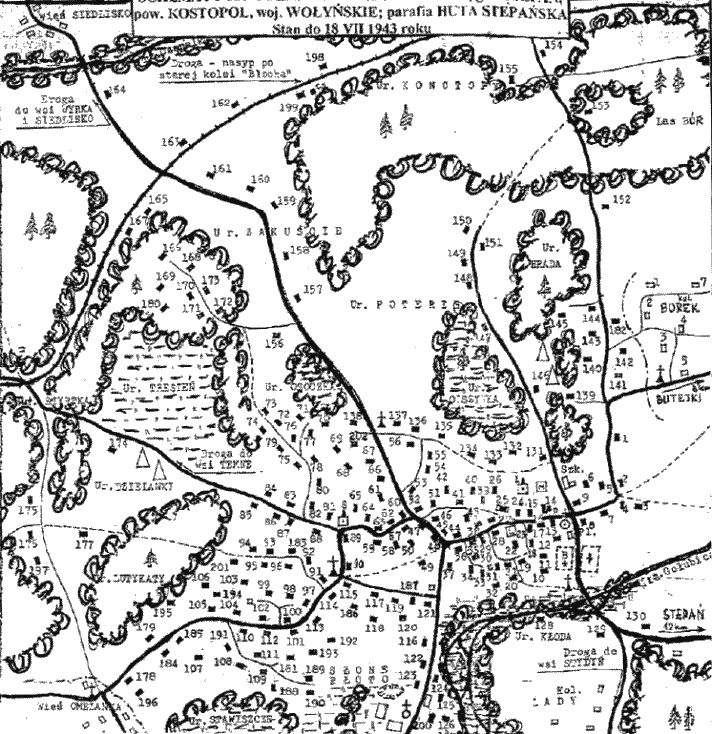 Wieś Huta Stepańska powstała w końcu XVII wieku na wypalonych obszarach lasu w Puszczy Stepańskiej. Założycielami Huty była rodzina zubożałej szlachty Sawickich, która przybyła tu spod Żytomierza. W księgach metrykalnych z XIX w. ze Stepania, pisano nazwę "Majdan zwany Hutą". Na mapach sprzed I wojny światowej widnieje nazwa "Majdan Huta". W Słowniku Geogr, Kr. Pol. tom XV, cz. I z 1900 r. jest zapis: Huta Stepańska - słoboda, gmina Stepań, 82 wiorst od Równego, 71 dymów, 208 mieszkańców. W spisie ludności z 1921 r. występuje jako "Huta" w gminie Stepań, pow. równieński, licząca 97 budynków mieszkalnych, 539 osób (489 katolików, 18 prawosławnych, 31 żydów, 1 ewangelik). Jako "Huta Stepańska" figuruje od 1922 r. tj. po powstaniu powiatu kostopolskiego. W 1922 r. w Hucie została erygowana parafia. Po 1930 r. powstało tu znane uzdrowisko borowinowo-solankowe "Słone Błoto". Huta stała się silnym ośrodkiem społeczno-kulturalnym i gospodarczym. Wg mapy sztabowej w 1937 r. w samej Hucie było 138 zagród, a w całej gromadzie (Huta, Wysoka Chwoina i Zakuście) w 1939 r. było ponad 200 zagród, zamieszkanych przez ponad 900 osób. W 1943 r. powstał tu liczący się ośrodek samoobrony, który przetrwał w walkach z atakującymi Ukraińcami do 18.07.1943 r. Wiele osób zginęło. Ocalała z ukraińskich pogromów skupiona tu ludność, ratując swe życie, opuściła rodzinne strony i dotarła do linii kolejowej pod Sarnami, skąd prawie wszyscy zostali wywiezieni na przymusowe roboty do Niemiec. (więcej w książce Cz. Piotrowskiego)WYKAZ GOSPODARSTW, stan w około 1939 r. (najdalej do 18 lipca 1943 r.). Użyte skróty: "WnrdN" oznacza "Wywiezieni na roboty do Niemiec", "B-W i 27WDPAK" - był/a w oddz. "Bomby"- "Wujka" i 27 Wołyńskiej Dywizji Piechoty AK od 22.07.1943 r. do 25.07.1944 r | 1. | SAWICKI | Józef 10.01.1905-28.02.1963 (*Lublin, przezwisko "Józik z Długiego Ogrodu") - s. Hipolita i Józefy z d. Wysocka, żona Jadwiga 7.01.1913-1986 z d. Chorążyczewska - c. Mariana i Anastazji z d. Sulikowska z Kamionki Starej, dzieci: Marian 7.07.1930, Helena 7.07.1931, Ryszard 21.05.1940. WnrdN. Po wojnie we Wrocławiu, następnie w Lublinie. | | 2. | SAWICKI | Longin 1900 - s. Bolesława i Klementyny z d. Borysowska, żona Filipina 1906 z d. Zielińska - c. Adama, córki: Leokadia 1927 i Jadwiga 1931. WnrdN. Po wojnie w okolicy Kłodzka. | | 3. | SAWICKI | Jan 1897 - s. Piotra, żona Helena 1900 z d. Popławska, synowie: Stanisław 1925 i Zygmunt 1929 (po wojnie oficerowie WP), córka Janina 1927. WnrdN. Po wojnie w Lublinie. | | 4. | SAWICKI | Piotr 1870-18.07.1943 (przezwisko "Dolar") - s. Klemensa i Rozalii z d. Borecka, żona Tekla 1871-29.11.1946 z d. Seredyńska z Omelanki - c. Józefa i Marianny z d. Borowska, zamieszkała po wojnie w Lublinie. Tekla miała brata Józefa (I ż.Waleria Szelążek, II ż.Antonina z Kołodyńskich Gąska). | | 5. | DROZDOWSKI | Franciszek 1885 - s. Franciszka 1853 i Marianny z d. Tomasik/Tomaszek (to druga żona Franciszka seniora), żona (śl.1910) Rozalia z d. Sawicka, synowie: Stanisław 1912 (ż Krystyna 1925 z d. Dawidowicz), Marian 1915 z żoną (córka Muzy Urbańskiej) i synkiem Ryszardem, Antoni 1917 i Mieczysław 1921, córka Janina 1919. Rodzina trudniła się tkactwem. Od 1942 r. mieszkała z nimi teściowa Mariana z córką Ireną 1924. W 1943 r. część rodziny WnrdN. Po wojnie we Wrocławiu, Darłowie i w Olsztynie. Franciszek miał brata Stanisława (ż.Helena Kaluss, śl.1918). | | 6. | SAWICKA | Elżbieta 1875-30.07.1943 z d. Felińska, wdowa po Piotrze (s.Juliana i Marianny z d. Słowikowska), zginęła, napadnięta pod Antonówką, syn Jan 1904 (poniżej), Władysław 1911 (B-W i 27WDPAK, ps."Ogórek", zesłany do łagru w Borowiczach, wypuszczony w 1947 r.), córki: Malwina 1912 (m.Henryk Sawicki z Borku), Genowefa 1915 i Franciszka 1924 (upośledzona psychicznie, zginęła z matką 30.07.1943 r.) Ocaleni WnrdN. Po wojnie większość w okolicy Wrocławia. | | SAWICKI | Jan - s. Piotra i Elżbiety, żona Albina z d. Szpryngiel, dzieci: Henryk, Zbigniew, Alicja i Bogumiła. WnrdN. Po wojnie w okolicach Gorzowa. | | 7. | - | Budynek kupiony od Stanisława Piotrowskiego w 1926 r. (z poz. 25) należał do braci Sawickich - Jana i Gracjana. Mieszkał tu m.in poprzednio ich szwagier Cynar z żoną Walerią (siostra Jana i Gracjana). Po 1930 r. Cynarowie przenieśli się do Równego. Potem w budynku tym mieszkał ks. wikary Franciszek RUTKOWSKI i uciekinierzy. | | 8. | SAWICKI | Gracjan - s. Franciszka 1903, żona Władysława 1909 z d. Sawicka - c. Bolesława, dzieci: Stanisław 1929, Czesław 1930 i Irena 1931. WnrdN. Po wojnie w USA. | | 9. | SAWICKI | Jan 1905, s. Franciszka, żona Bronisława 1909 z d. Myczewska z Omelanki, córki: Barbara 1930, Krystyna 1938. Do 1939 r. Jan był właścicielem sklepu wielobranżowego. Po opuszczeniu Huty wiosną 1943 r. rodzina zatrzymała się w Warszawie, gdzie w 1944 przeżyła Powstanie. | | 10. | LIPIŃSKI | Ksawery 1913 - s. Konstantego i Michaliny z d. Kołodyńska, żona Stanisława z d. Lipińska 1917 - c. Dionizego, dzieci: Marian 1935, Barbara 1939. Mieszkała z nimi babcia Stanisławy - Józefa Lipińska 1850 z d. Popławska (wdowa po Ignacym). Do 1945 r. pozostali w Sarnach. Po wojnie w Gorzowie. | | 11. | GNIETECKI | Jan 1873 - s. Piotra i Karoliny z d. Lech, żona Anna 1876 z d. Libera - c. Jana, dzieci: Janina (Chomicz, syn poniżej), Helena 1906 (po m. Sawicka - rozwiedziona), Stanisław (poniżej). WnrdN, gdzie Jan i Anna zaginęli bez wieści. | | GNIETECKI | Stanisław 1912, żona Anastazja 1916 z d. Serafinowicz - c. Hipolita i Bronisławy z d. Myczewska z Borsuków, dzieci: Mirosława 1938 i Ryszard 1940. Po wojnie w Argentynie, od 1964 r. w USA. | | CHOMICZ | Czesław 1925 - s. Michała i Janiny z d. Hnetecka. Po wojnie w Lubaniu. | | 12. | SKRZYBALSKI | Konstanty 1908-1966 - s. Franciszka i Józefy z d. Zawadzka, żona Filipina 
