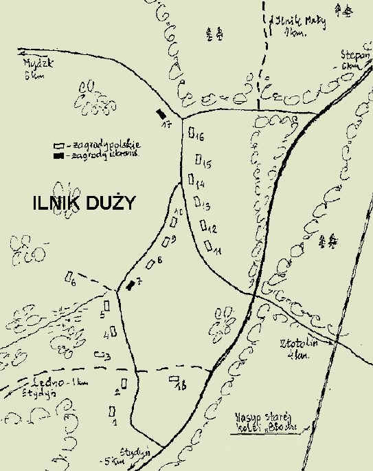 Wykaz w poz. 1-18 oraz szkic miejscowości jest z publikacji Cz. Piotrowskiego, opartej na opracowaniu Antoniego Przybysza korzystającego z informacji d. mieszkanek Ilnika Dużego: Józefy Maksymowskiej i Heleny Matusiak. (Głogów - Warszawa, styczeń - sierpień 1998r.) Data powstania strony: marzec 2008 r., ostatnia edycja: czerwiec 2015 r.