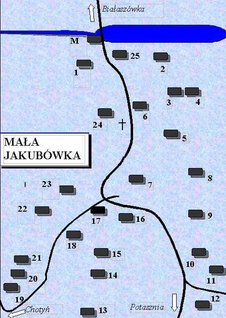 Kolonia Jakubówka Mała powstała w wyniku parcelacji majątku ziemskiego rodziny Falkowskich na prawym brzegu rzeczki Komarnia (prawy dopływ Słuczy), stąd też popularnie w okolicy kolonię tę nazywano Komarnią. Po przeciwnej stronie rzeczki leżała duża wieś ukraińska Białaszówka, licząca ok. 200 zagród. Zabudowania Jakubówki były rozrzucone stosownie do zajmowanej ziemi. Dzieci chodziły do szkoły w Białaszówce, albo do odległej o 4 km w kierunku południowym 6-cio klasowej szkoły w Rudnej Potasznii. Tam też, znajdował się kościół parafialny do którego uczęszczali mieszkańcy Jakubówki Małej. Był tu młyn gospodarczy (M) – własność Felicjana Falkowskiego – drewniany, kryty gontem, wodny na dwa kamienie o średnicy 1 m i zdolności przemiałowej 2000 kg na dobę. W młynie wodnym mielono tylko żyto i pszenicę, inne zboża mielono w Potaszni, gdzie były dwa młyny żydowskie. WYKAZ GOSPODARSTW, stan w około 1939 r. (najdalej do 3 V 1943r.) 1. | FALKOWSKI | Felicjan - s. Władysława i Apoloni z d. Fedorowska, żona (śl.1910) Adela 1889 z d. Bagińska z Małej Klecki, była matką chrzestną bardzo wielu dzieci z Małej Jakubówki; małżeństwo bezdzietne, wzięli na wychowanie Antoniego Falkowskiego (poniżej). Felicjan nie przeżył wojny. | | FALKOWSKI | Antoni 1910 - s. Jana i Marianny z d. Maszkowska, żona Czesława 1910 z d. Kwiatkowska z Futoru Kościelnego - c. Lucjana i Anieli z d. Kuriata, wdowa po Narcyzie Kuriacie z Rudni Pohorylowskiej (poległ w wrześniu 1939r.), z którym miała córkę Danutę 1939. Antoni z żoną, pasierbicą i ciotką Adelą przybył do Sobótki 11.11.1945 r. | | FALKOWSKI | W tym samym domu, posiadającym dwa osobne wejścia mieszkał brat Felicjana - Roman z rodziną. Roman zmarł przed wojną, podobnie jak jego córka Władysława. Był jeszcze jego syn Grzegorz, natomiast drugi syn, Władysław, razem ze swoją żoną Rozalią mieszkał w Bereźnikach. | 2. | FALKOWSKI | Gracjan - s. Felicjana i Katarzyny z d. Kuriata, wdowiec po Elżbiecie z d. Sawicka, dzieci: Felicjan (w poz.20), Antonina (Kuriata, w poz.23), Czesława 1906 (Chorążewska, w Siwkach), Adam 1910 (poślubił 20.11.1940 w Ludwipolu Franciszkę Łoś 1915 z Małej Klecki z którą miał córkę Bogusię), Józef 1918 (wzięty w 1940 r. do Armii Czerwonej, potem w Armii Polskiej, po wojnie w Lubaniu, następnie w Świdniku k/Lublina, poślubia Marię Augustniak), Helena 1921, Kazimierz (został z grupą innych wywieziony w 1942 r. na roboty do Niemiec, po wojnie ż.Bronisława Łoś), Stanisława i Mikołaj. Po wojnie rodzina Gracjana zamieszkała w Wyrębie k/Lubania Śląskiego i okolicy. (Gracjan posiadał dokumenty świadczące o szlachectwie rodu Falkowskich, sięgające co najmniej XVII. Dokumentów było wiele, zostały przywiezione przez niego po wojnie do Wyręby. Jednak ze względu na czasy wojenne, nie były one należycie zabezpieczone a później konserwowane, wskutek czego uległy pewnemu zniszczeniu i dziś są niezbyt czytelne). | 3. | ŻYGADŁO | Witalis, żona Janina z d. Falkowska - c. Jana, syn Franciszek | 4. | ŻYGADŁO | Gabriel, żona Ludmiła z d. Kuriata, dzieci: Franciszek i Leontyna | 5. | ŁOZIŃSKI | Józef ?, żona z d. Żygadło, syn. | 6. | FALKOWSKA | Anastazja z d. Żygadło, wdowa po Szymonie - s. Feliksa i Katarzyny z d. Kuriata, synowie: Wacław (poniżej), Florian (poz.22), Teofil (poz.22) i Antoni (poz.21). Rodzina zamieszkiwała w domu koło młyna wodnego. | | FALKOWSKI | Wacław, żona Janina z d. Łozińska, dzieci Alfred, Zofia, Stanisława 1932. Po wojnie na Dolnym Śląsku. | 7. | FALKOWSKI | Józef 1888-1976 - s. Lucjana (s. Felicjana i Katarzyny z d. Kuriata) i Anieli z d. Prokopowicz, żona Anna 1900 z d. Kalińska - jej matka (IN.) z d. Różańska, dzieci: Eugeniusz 1930, Julian 1931, Alfons 1933, Ryszard 1937. Anna, uprzedzona o rzezi przez ukraińskiego sąsiada, 3 maja wyprowadziła z Jakubówki część polskich rodzin. Po wojnie we Wrocławiu. | | BEKIESZCZUK | Roman, żona Janina z d. Falkowska - c. Lucjana i Anieli z d. Prokopowicz, dzieci: Zbigniew, Genowefa, Teresa, Barbara i Antonina - z mężem. Rodzina po wojnie osiedliła się w okolicach Lidzbarka Warmińskiego. | | GROCHALA | Henryk, żona Antonina - c. Romana i Janiny z d. Falkowska | 8. | ŻYGADŁO | Michalina, wdowa, dzieci: Józef, Antoni (listonosz w Michalinie), Józefa i Zofia. Mieszkali w nowo wybudowanym, trzypokojowym domu, jedyny w okolicy kryty blachą. Józef był w oddz. AK ,,Bomby"-,,Wujka" na Zasłuczu - IX-XII 1943. | 9. | KURIATA | Michał, żona Michalina z d. Żygadło, dzieci: Antonina (Żygadło, w Niemilji), Adolf (poniżej), Feliks (zm.przed wojną, miał żonę i 2 córki). | | KURIATA | Adolf - s. Michała i Michaliny, żona Emilia, dzieci: Franciszka i Alfred. Adolf do 1939 r. był sołtysem Jakubówki. W okresie wojny, przez wieś często przejeżdżały bandy ukraińskie strzelając czasem na oślep, aby napędzić Polakom strachu. Podczas jednego z takich przejazdów Adolf przypadkowo (jak się sądzi) został śmiertelnie trafiony. Po wojnie koło Wrocławia. | 10 | CHORĄŻEWSKI | Adam, żona Rozalia z d. Falkowska - c. Klemensa, dzieci: Wanda (być może były także inne dzieci). | 11 | FALKOWSKI | Józef 1904-1986, żona Janina 1902-1986 z d. Dziembowska - c. Marcina i Pauliny z d. Żygadło z Antolina (w Kurhanach); dzieci: Leokadia 1924, Stanisława 1926, Stefania 1932, Zofia 1936-zm. w dzieciństwie, Leon 1937-zm. w dzieciństwie, Aleksander 1939 -zm. w dzieciństwie, Stefan 1942. (zaraz po wojnie Antoni i Maria). | 12 | FALKOWSKI | Jan, żona Marianna, dzieci: Paulina (Morawska, w Onyniu), Antonina (m.Franciszek Babińskim, mieszkali poza Jakubówką), Janina (Żygadło, w poz. 3), Antoni (mieszkał u Felicjana Falkowskiego), Bolesław, Adela, Zofia, Leon, Władysław i Stanisław (powołany przed wojną do wojska, nigdy nie powrócił). | 13 | KWIATKOWSKA | W pewnym oddaleniu od kol