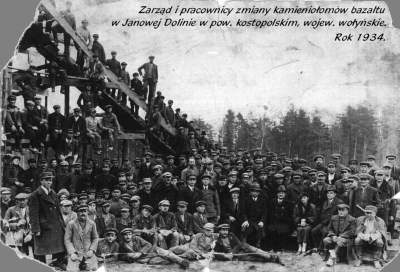 Piłkarska drużyna KS Strzelec została założona w Janowej Dolinie w latach 20. XX wieku. Nie wszyscy mogli otrzymać od razu mieszkanie, bo Janowa była jeszcze w rozbudowie. Część ludzi mieszkało w ziemiankach lub jak Stanisław Cichawa z rodzicami w wyeksploatowanej smolarni, słowem - gdzie się dało. Projekt WYKAZU GOSPODARSTW osady z przysiółkami, stan z około 1939 r. (najdalej do 1943 r.) | 1a. | SZUTKOWSKI | Leonard 1887-1940, por. rez., inż. górnik, Dyrektor Kamieniołomów. Wywieziony na śmierć do Kijowa. Żona została zabrana na Sybir. | | 1b. | NIWIŃSKI | Józef 17.03.1901-13.04.1940 (+Katyn) - s. Konrada i Janiny z d. Czarnecka, inżynier, zastępca dyrektora Państwowych Kamieniołomów w Janowej Dolinie, żona Irena, dzieci: Teresa, Alina 1931 (Kłobukowska), Krzysztof. Zabrani na Sybir. | 2. | URBANOWICZ | Michał, inżynier (na zdjęciu pracowników kamieniołomu podpisał na odwrocie: "pamiątka roboty w Janowej Dolinie Michał Urbanowicz 1934 r."). | 3. | DĄBROWSKI | Jan 1909 (*Jeziorko) - s. Wincentego i Adeli z d. Dybowska, leśniczy w Kiwercach i Janowej Dolinie, żona Bronisława 1906 z d. Boguc, syn Henryk 1940. Jan w latach 1927-1929 służył w wojsku, w 27 pułku artylerii lekkiej we Włodzimierzu Wołyńskim, gdzie ukończył szkołę podoficerską w stopniu kaprala. Grał w orkiestrze wojskowej. 13.09.1940 r. aresztowany i wywieziony do Miedwieżegorska nad jeziorem Onega. Rodzina ukryła się w Przebrażu. Po zwolnieniu z zesłania w 1943 r. wstąpił do I Armii W.P., III Dywizji Piechoty im. R. Traugutta, walczył na Pradze, o Kołobrzeg i Wał Pomorski, dotarł do Berlina. Po wojnie odnalazł rodzinę, z którą osiedlił się w Królowej, woj. opolskie. Swoje wspomnienia z zesłania spisał wierszem i prozą, natomiast walki w I Armii WP opisał w pamiętniku. | | 4. | DĄBROWSKI | Władysław 1913 (*Jeziorko) - s. Wincentego i Adeli z d. Dybowska, żona Władysława 1914 (*Rokitno) z d. Tuszyńska - c. Stanisława, leśniczy w Janowej Dolinie, dzieci: Anna 1936 i Urszula 1938. Rodzina 10.02.1940 zesłana do Tiesowaja obł. Archangielsk. Po tzw. amnestii w 1941 r. Władysław wyjeżdża z rodziną do Kazachstanu gdzie pracuje w miejscowości Merka. W 1942 r. w miejscowości Ługowa wstępuje do armii gen. Andersa, z którą ewakuuje się do Persji. Rodzina niestety aż do 1946 r. pozostaje w Kazachstanie, gdzie żona Władysława w bardzo ciężkich warunkach pracuje w sowchozie. Władysław bierze udział w walkach o Monte Cassino, Bolonię, Porto, Lorento, Ankonę i Faenzo. Zagrożony aresztowaniem przez władze komunistyczne pozostaje na emigracji i wyjeżdża do Argentyny. Żona z córkami, po powrocie z zesłania osiedliła się w Jeleniej Górze. | 5. | MENDYK | Władysław 28.08.1910-16.07.1962 - s. Michała i Antoniny, żona Maria 7.03.1915 z d. Magdzińska - c. Ludwika i Bronisławy z d .Parzyńska, dzieci: Mirosława ~1935, Kazimierz 4.02.1937, Eugeniusz 4.10.1939-16.08.2008. Po wojnie Maria z dziećmi w Olsztynie, Władysław - Osieki, Zachodniopomorskie. Rodzeństwo Marii to: Edward, Leon i Jan (w poz. 45) oraz Melania (Werbolewska, w poz. 49). | 6. | BOGDANOWICZ | Bronisław 1886-1943, pracownik buchalterii dyrekcji kamieniołomów, żona Anna, syn Tadeusz. | 7. | BERNAT | Walenty 1896 - s. Piotra, żona Stefania, dzieci (*Grabina): Janina 1928, Irena 1929, Krystyna 1936, Leszek 1936. Zabrani na Sybir. | 8. | BATOR | Józef 1897 - s. Feliksa i Marianny z d. Rozpond, żona Rozalia 1900 z d. Suwaj, dzieci: Jan 1921-1940 (na zdjęciu), Stefan, Maria, Mieczysław, Halina, Stanisław i Edward. W latach trzydziestych przybyli tu z Choczni k.Wadowic i zamieszkali przy ulicy B nr 39, na dole. Praca w kamieniołomie. Jan i Stefan aresztowani w 1940 przez NKWD, Jan zamordowany w Starobielsku, Stefan skazany na 5 lat na Kolyme. W 1941 r. pozostała rodzina, oprócz już zamężnej Marii (m.Wacław Ramult, po wojnie w Choczni), wysiedlona do Kazachstanu. Rozalia zmarła w drodze do Persji. W 1942 Józef wstąpił do tworzącego się wojska Andersa. Mieczysław, Stanisław i Edward wstąpili do Junaków. Halina oddana do sierocińca, wstąpiła w Persji do PSK i służyła w Szkocji. Żyjący bracia spotkali się w Palestynie w 1942, a w 1944 Stefan i Mieczysław znowu widzieli się pod Monte Cassino. Józef zwolniony z wojska dołączył do cywilnego obozu w Isfachanie i następnie w Indiach. Po wojnie, męska część rodziny zostali w Anglii. Halina wyszła za mąż i wróciła z mężem do Polski. | 9. | KARWAN | Jan, żona Jadwiga. | 10. | SOBOŃ | IN., syn Bogusław. | 11. | WYSOKIŃSKI | Jan 1904, żona z d. Dolbizno, 2 synów. Mieszkała tu też siostra Jana z mężem i dziećmi. Wysokińscy mieszkali wcześniej w Złaźnem, a pochodzili z Garwolina. W 1943 r. rodzina wywieziona na roboty do Niemiec, (www) | 12. | JARECKI | Kazimierz, żona Aniela z d. Żołądziewska, dzieci: Witold lat 4, Ryszard lat 3. [inf. Aleksandra Zbierska fortfox(a)go2.pl] | 13. | JANUCHOWSKI | IN, komendant policji, córka Urszula. | 14. | ZARĘBSKI | Marian 1910-1991, żona Bronisława 1906-1992 z d. Walczyk, syn Janusz 1936. Marian był nauczycielem historii i wychowawcą w tutejszej szkole powszechnej, po aresztowaniu przez NKWD jesienią 1939 r. więzień Kijowa, Charkowa, skazany na karę śmierci, zamienioną na dziesięć lat łagrów - Uchta n/Peczorą. Wstąpił do Armii Andersa, walczył m.in. pod Monte Cassino. Powrócił z Anglii do Polski w 1948 r. Bronisława była kierowniczką tutejszej szkoły powszechnej, po aresztowaniu męża schroniła się z synkiem u rodziny w Równem. Stamtąd wraz z bliskimi, ostatnim transportem przewieziona w czerwcu 1945 r do nowej Polski. Osiedli w Strzelcach Opolskich. | 15. | PISULA | IN, syn Tadeusz był drużynowym 55 drużyny Z.H.P. | 16. | SAWICKI | Bronisław +1943, żona Ola (Aleksandra) +1943 - c. Anny Oborskiej, córka Bożena +1943. | | OBORSKA | Anna. | 17. | HELEN | IN. | 18. | PROBUCKI | IN. | 