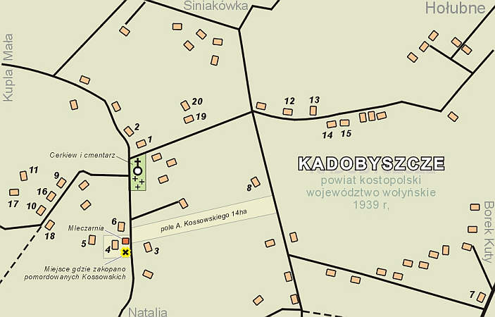 1937, Alfreda 1938-1939. V.n.: Herentjer. | | 45. | CHOJNA | Michał 1911-1943 - s. Marcelego i Sabiny (p.18), żona Marianna 1912-1996 z d. Szymańska z Natalji, córka Teresa 1938-1998 (Wawrzynowicz). Po wojnie w Prabutach następnie w Kwidzynie i w Świnoujściu. | | 46. | ELKE | IN. (Niemiec). | | 47. | SOŁOTKO | Mitka (Ukrainiec). | | 48. | KOZUSZEK | IN. (Niemiec). | | 49. | KOSSOWSKI | Jan, żona Stanisława z d. Krajewska, dzieci: Antoni 15.02.1920, Róża (Gryszczuk, po wojnie w Kanadzie). Po wojnie w Kwidzynie. | | 50. | GDAWSKI | Franciszek, żona Zofia z d. Kilkus, dzieci: Janina 1940, Mieczysław 1942. | | 51. | KACZOROWSKI | Jan, właściciel sklepu, żona Anastazja z d. Trzeszcz; synowie: Adam (poz. 52), Adolf (poniżej), Teofil (po wojnie w Pieniężnie), Walerian (poniżej), Franciszek (poniżej). | | KACZOROWSKI | Adolf, żona Zofia z d. Hołubecka, dzieci: Jadwiga Rozalia 1941. Po wojnie w Szczecinku. | | KACZOROWSKI | Walerian 1909 (*Nowosielica Połońska), żona Aniela z d. Rogula, dzieci: