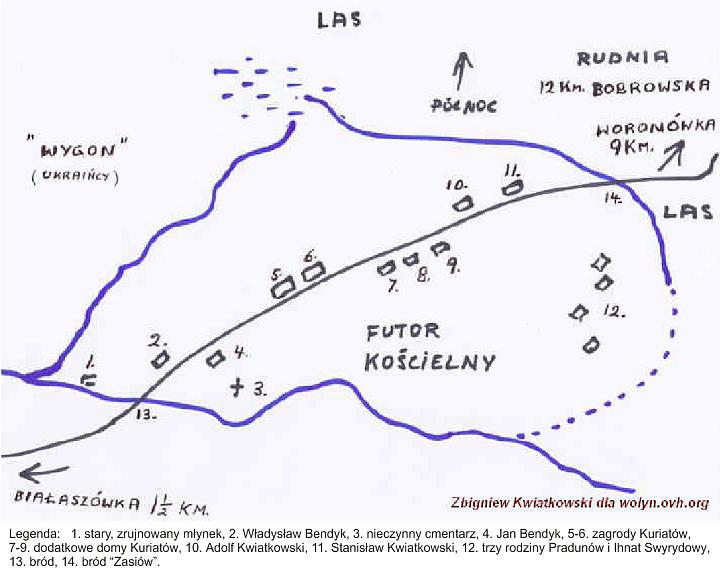 Po wojnie powrócił do Kraju i odszukał żonę. | | 6. | KURIATA | Franciszek ("kulawy Franio"), żona Helena z d. Żygadło, dzieci wieku szkolnym: 2 córki IN i syn IN. Dom jeszcze nie wykończony, stał po prawej stronie drogi idąc w kierunku Białaszówki. W 1943 r. w ich stodole banderowcy spalili dziewięcioro osób (IN.). | | 7. | SWYRYDOWY | Ihnat, żona Zofia. Rodzina ukraińska. |